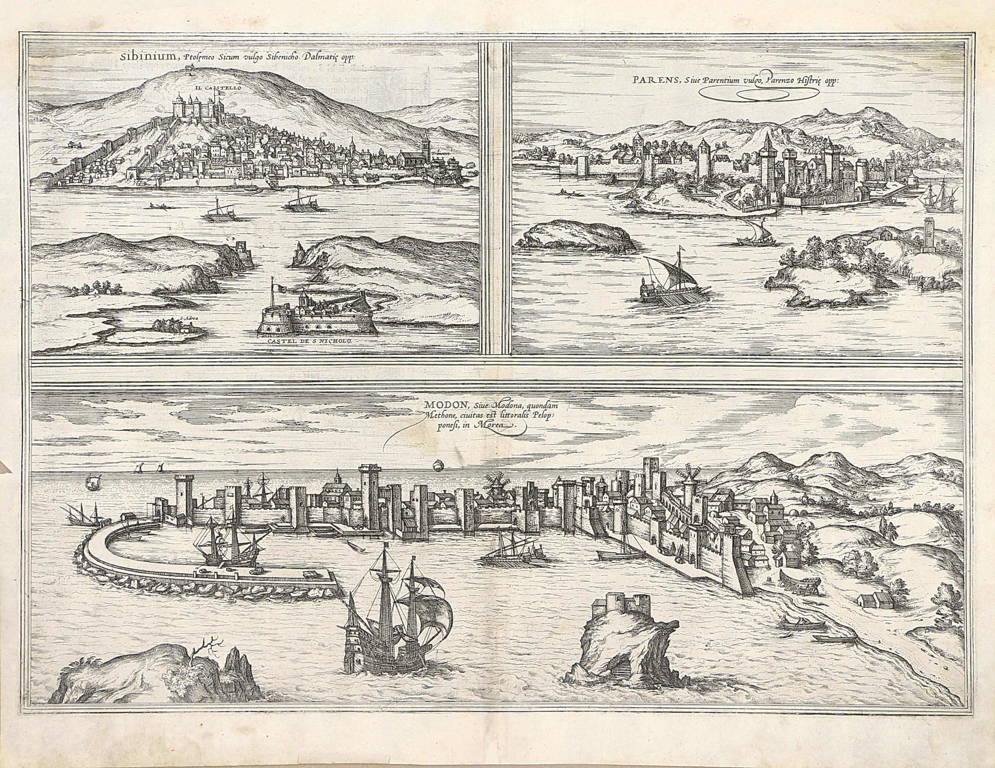 Braun, Georg - Hogenberg, Frans: Sibinium, Ptolemeo Sicum vulgo Sibenicho. Dalmatie Opp. ... Parens, sive Parentium vulgo, Parenzo Histriae Opp. ... Modon, sive Modona, quondam Methone, Civitas est Littoralis Pelopponesi, in Morea.