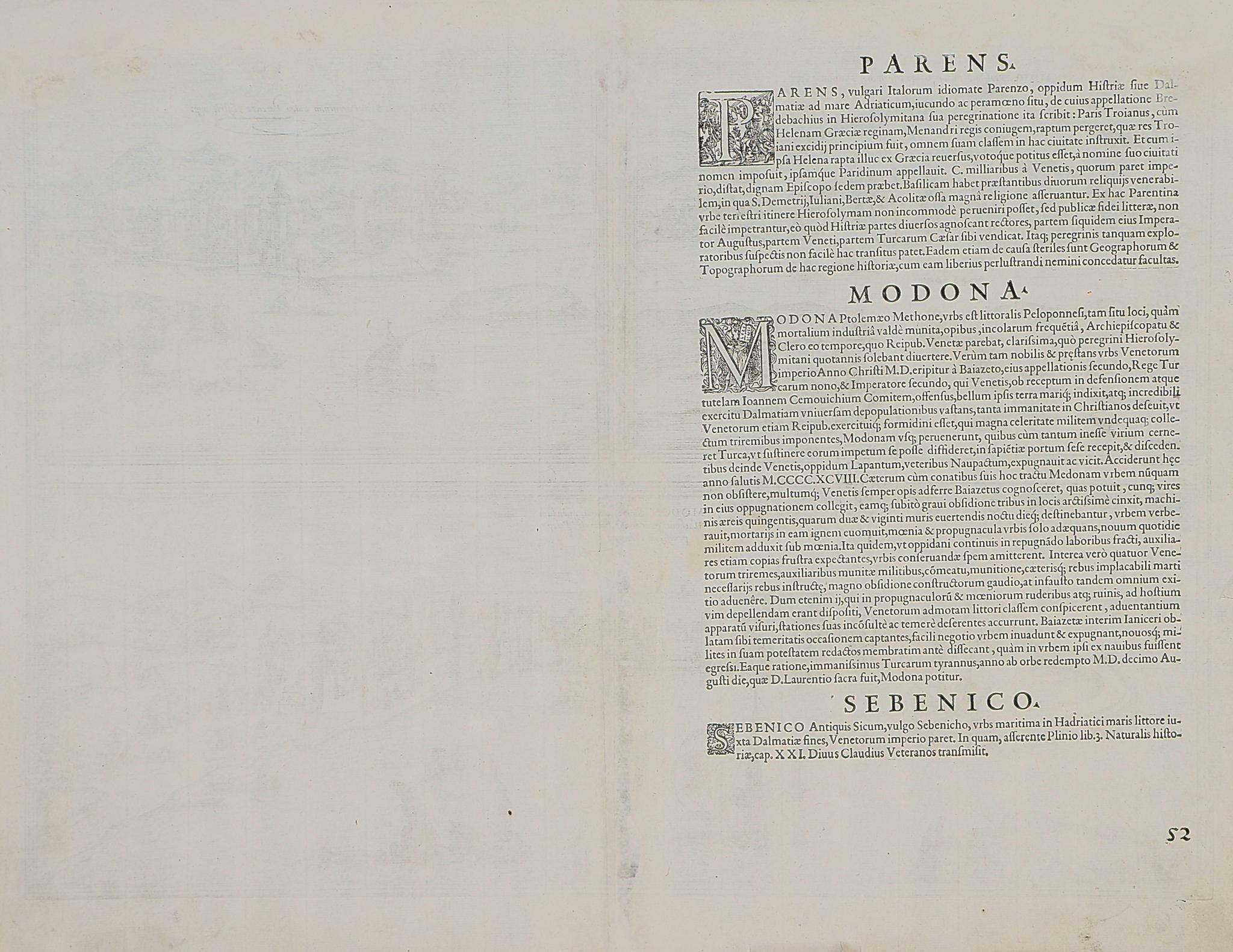 Sibinium, Ptolemeo Sicum vulgo Sibenicho. Dalmatie Opp. ... Parens, sive Parentium vulgo, Parenzo Histriae Opp. ... Modon, sive Modona, quondam Methone, Civitas est Littoralis Pelopponesi, in Morea.