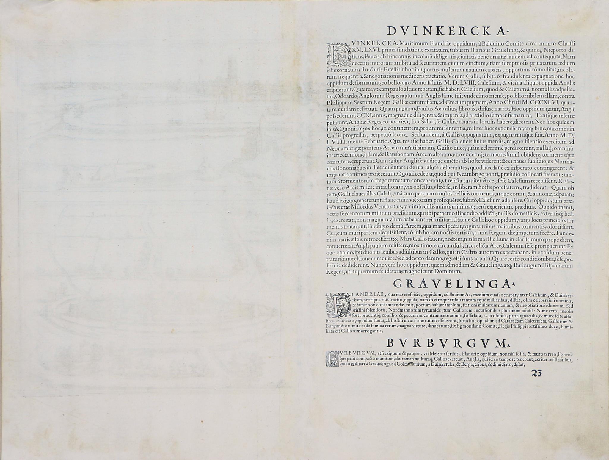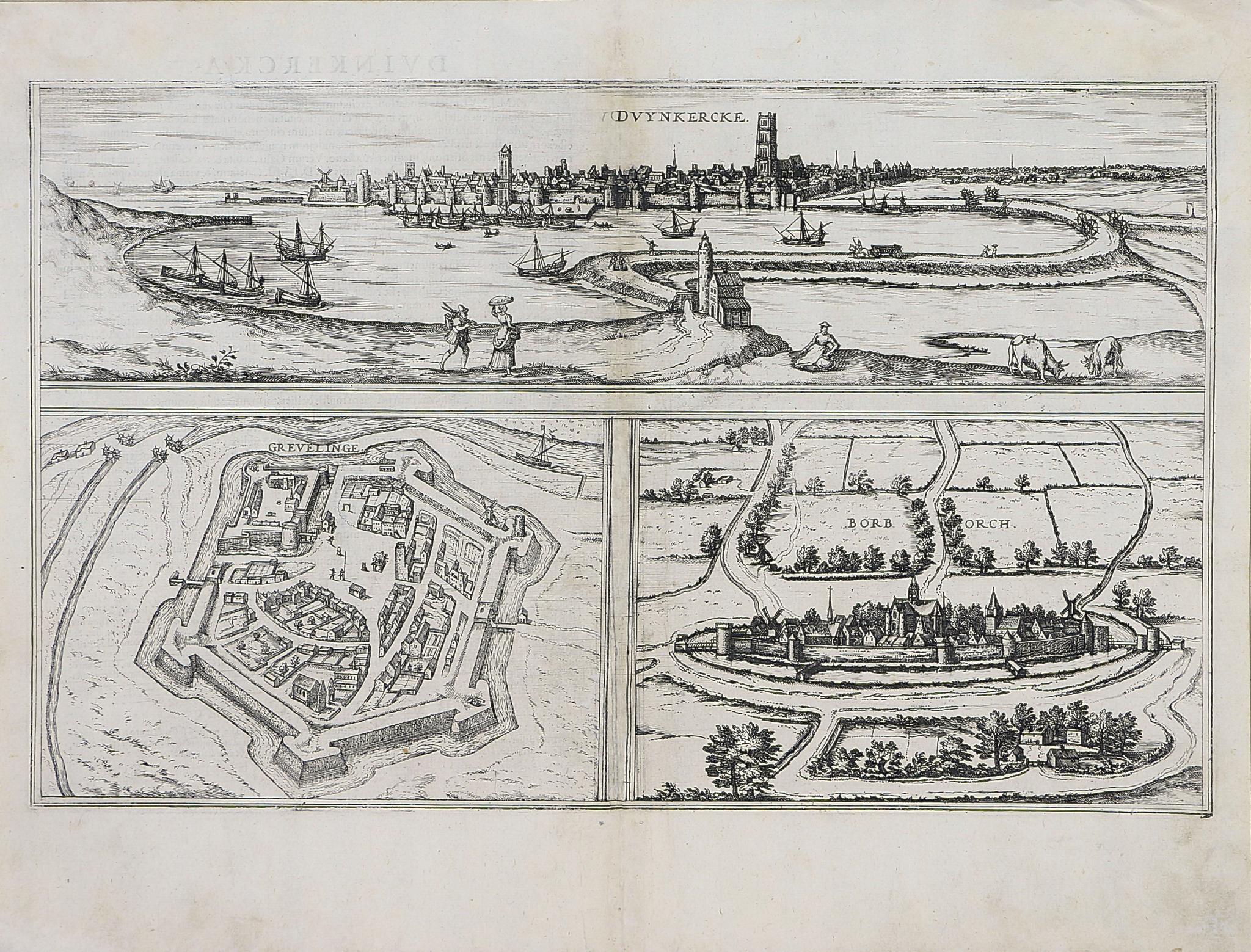 1572 Cologne [Köln]Dunkerque, Gravelines és Bourbourg látképe, a verson a városok latin nyelvű leírásával.