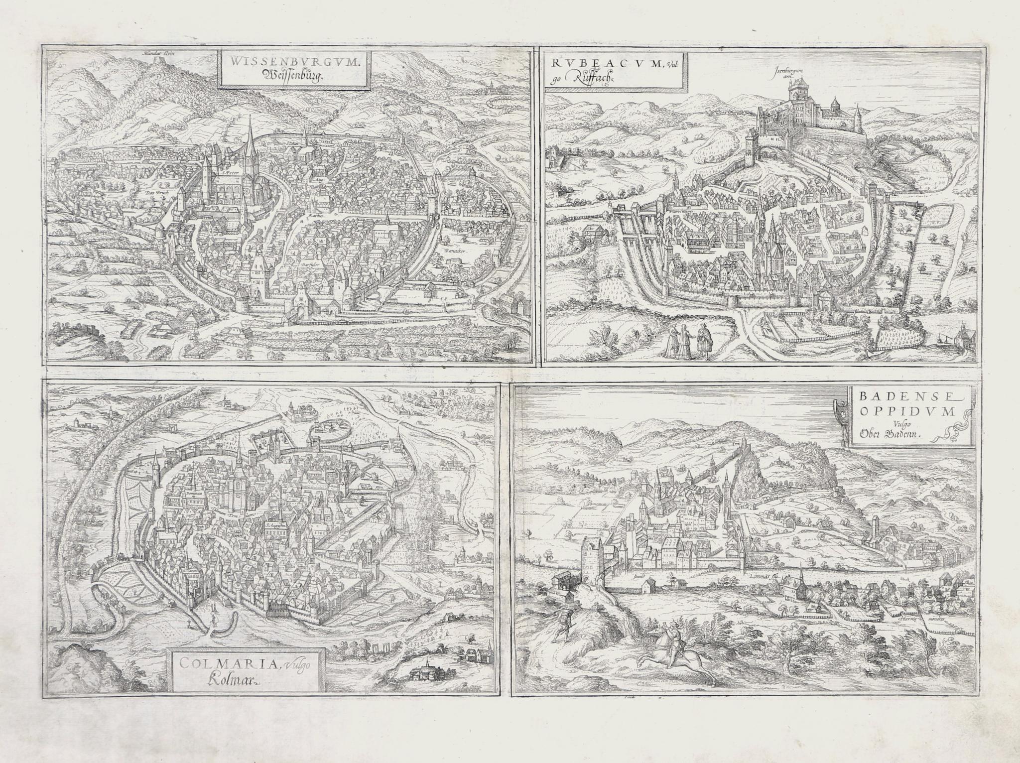 Braun, Georg - Hogenberg, Frans: Wissenburgum. Weissenburg; Rubeacum, Vulgo Russach; Colmaria, vulgo Kolmar; Badense Oppidum Vulgo Ober Badenn.