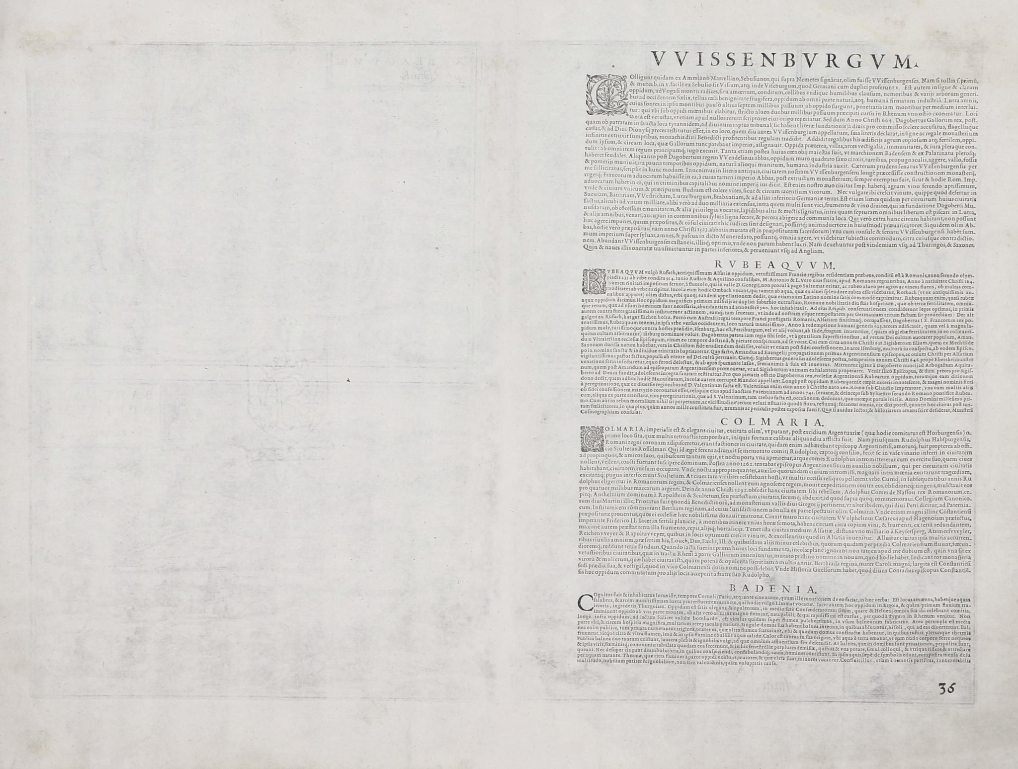 Wissenburgum. Weissenburg; Rubeacum, Vulgo Russach; Colmaria, vulgo Kolmar; Badense Oppidum Vulgo Ober Badenn.