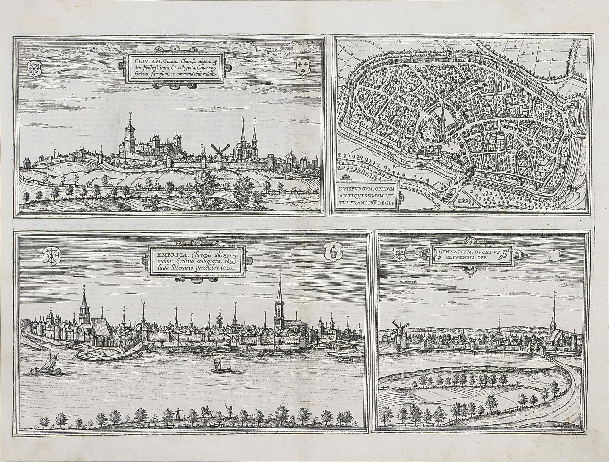 Braun, Georg - Hogenberg, Frans: Cliviam, Ducatus Clivensis ... Duisburgum ... Embrica, Clivensis ditionis ... Gennapium Ducatus Clivensis.