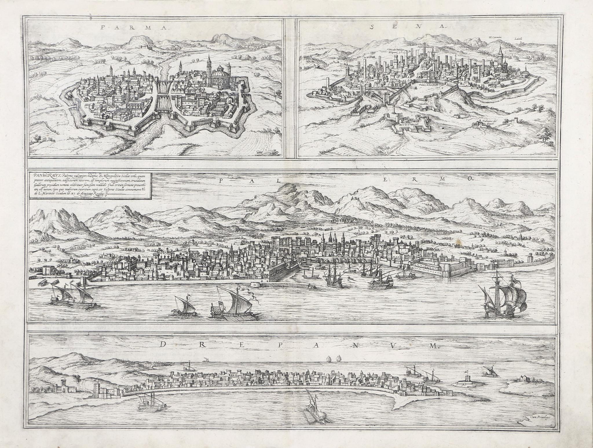 Braun, Georg - Hogenberg, Frans: Parma [egy lapon] Sena [et] Panhormus, Palermo vulgariter, ... [et] Drepanum. Cum Privilegio.
