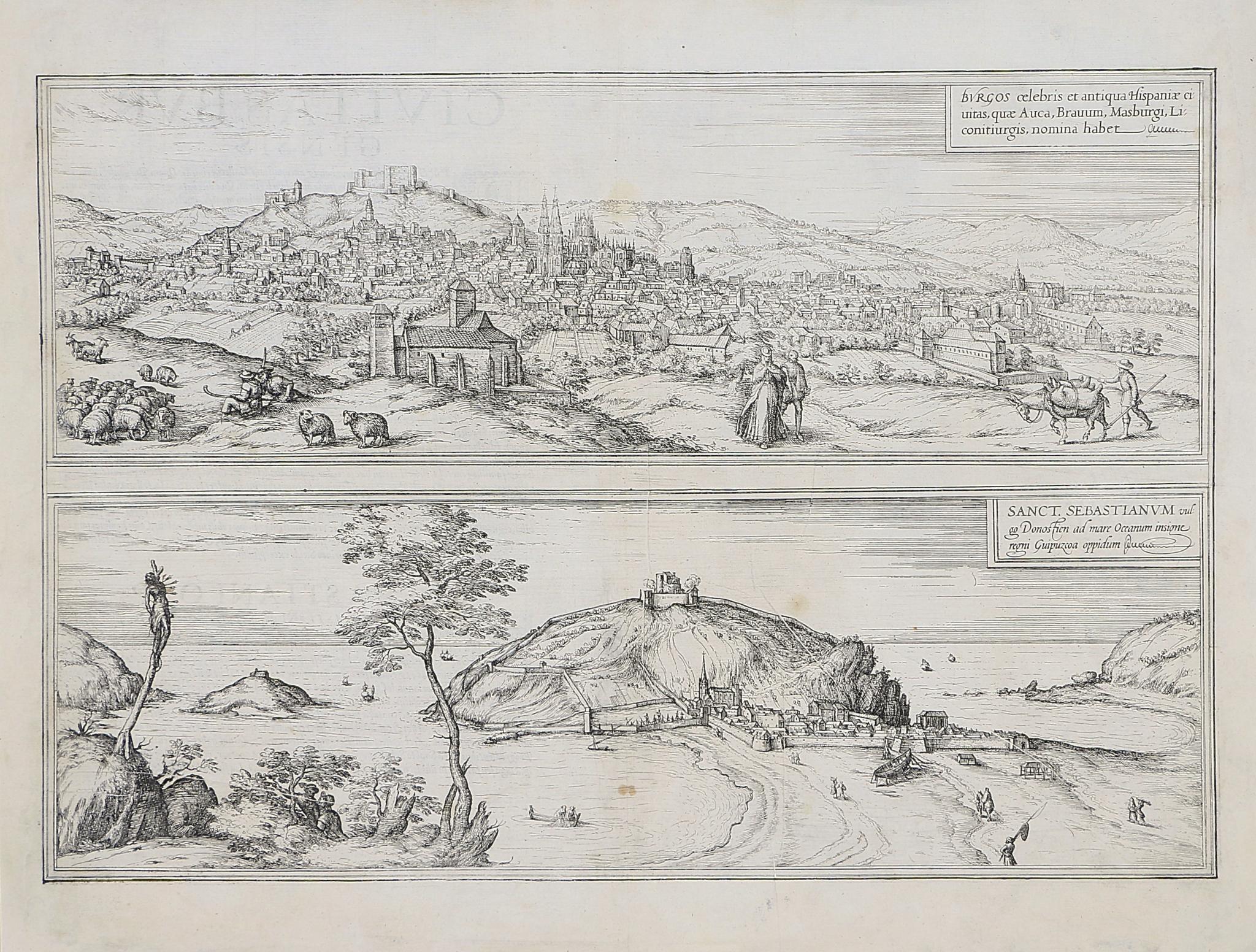 Braun, Georg - Hogenberg, Frans: Burgos celebris et antiqua Hispaniae civitas, ... [on sheet with] Sanct. Sebastianum vulgo Donosien ad Occanum ...