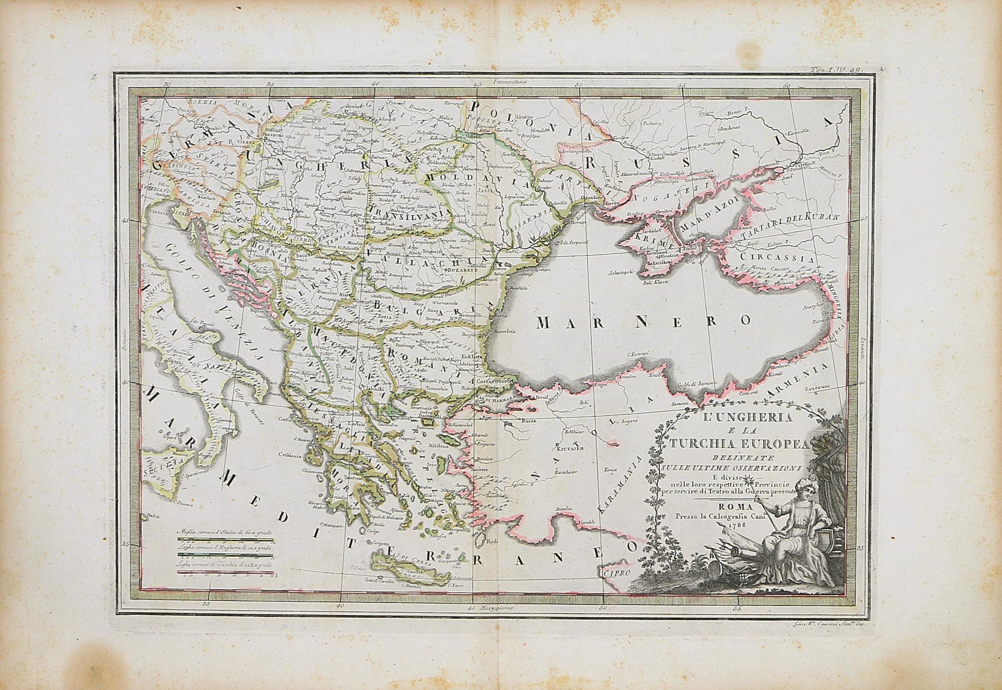 1788 Róma [Rome]Cassini gyönyörű, kézzel színezett rézmetszetű térképe Magyarország és az európai Törökország címmel, mely Görögországot és a Balkánt, Németországot, a mai Ukrajnát és Olaszország egyes részeit is ábrázolja. A Földközi-tenger keleti részét, a Velencei-öblöt és a Fekete-tengert ábrázolja.