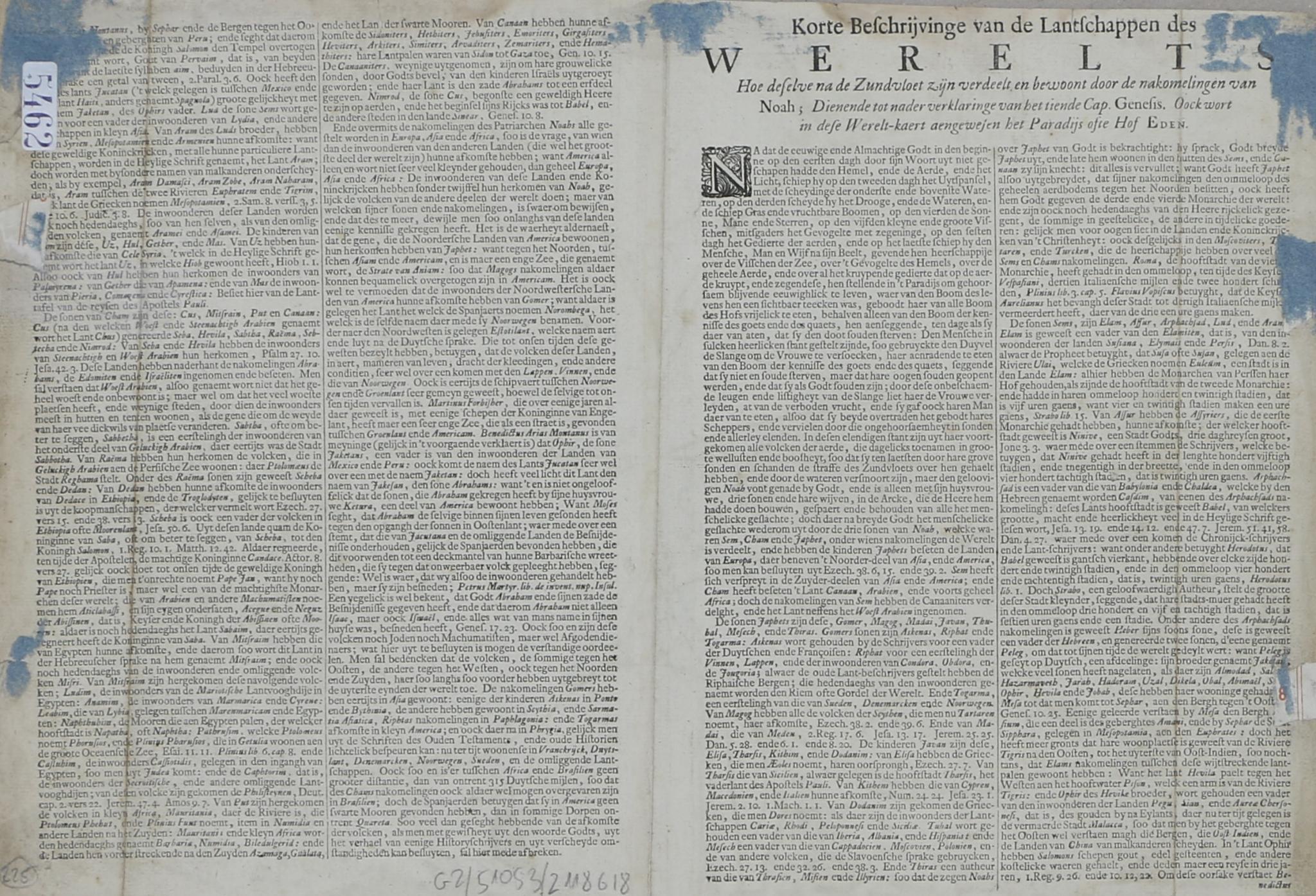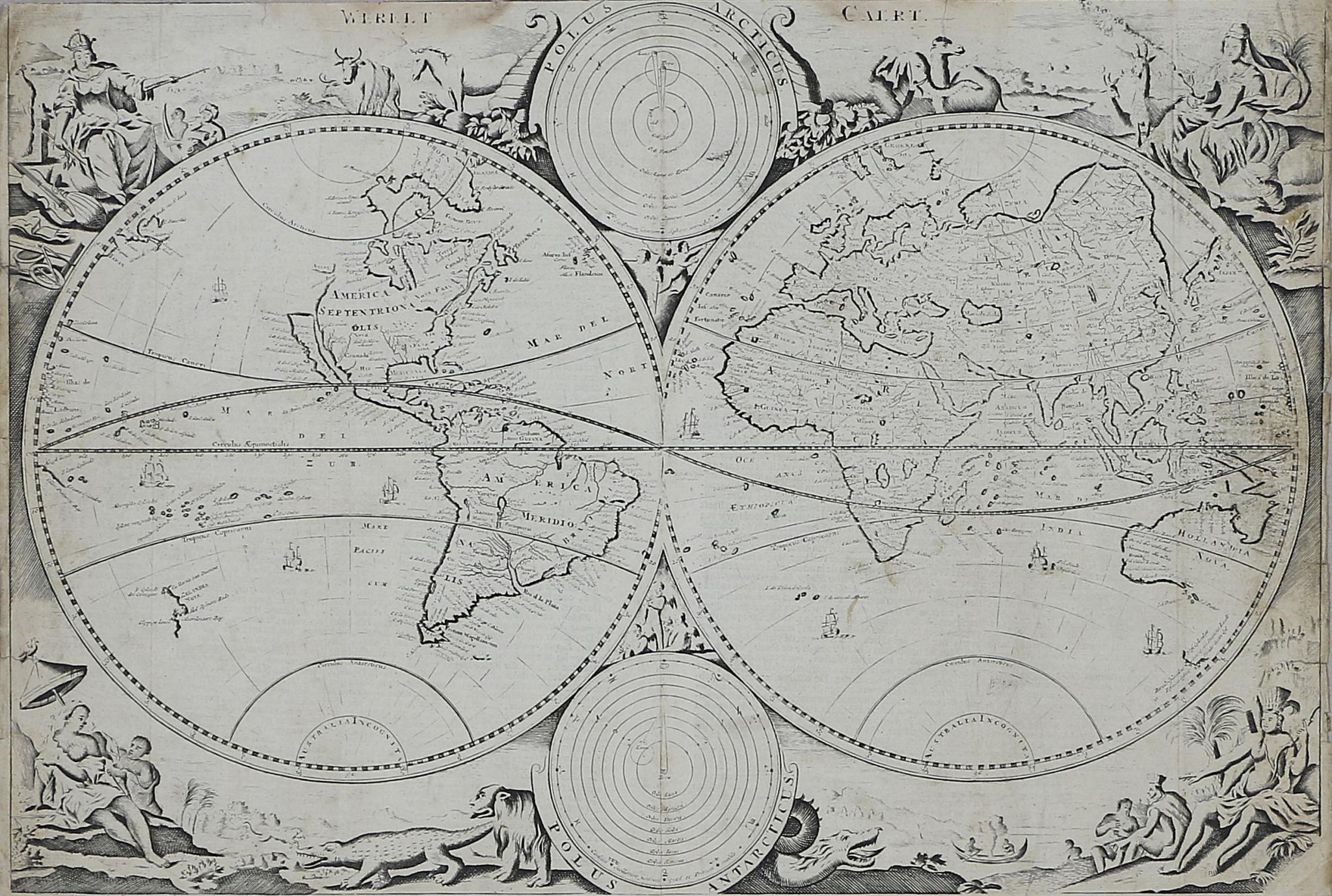 A Stoopendaal által a Keur-Bibliához készített rendkívül részletes kettős féltekés világtérkép, melyet díszes, allegorikus kartusok vesznek körül. A hátoldalon holland szöveggel.