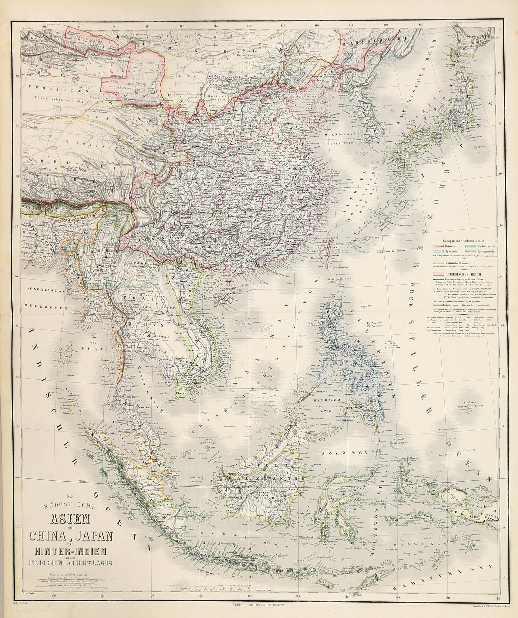 Kína, Japán és Kelet-India részletes, a weimari Földrajzi Intézet által kiadott térképe színes kulcs segítségével mutatja be az európai gyarmati hatásokat.