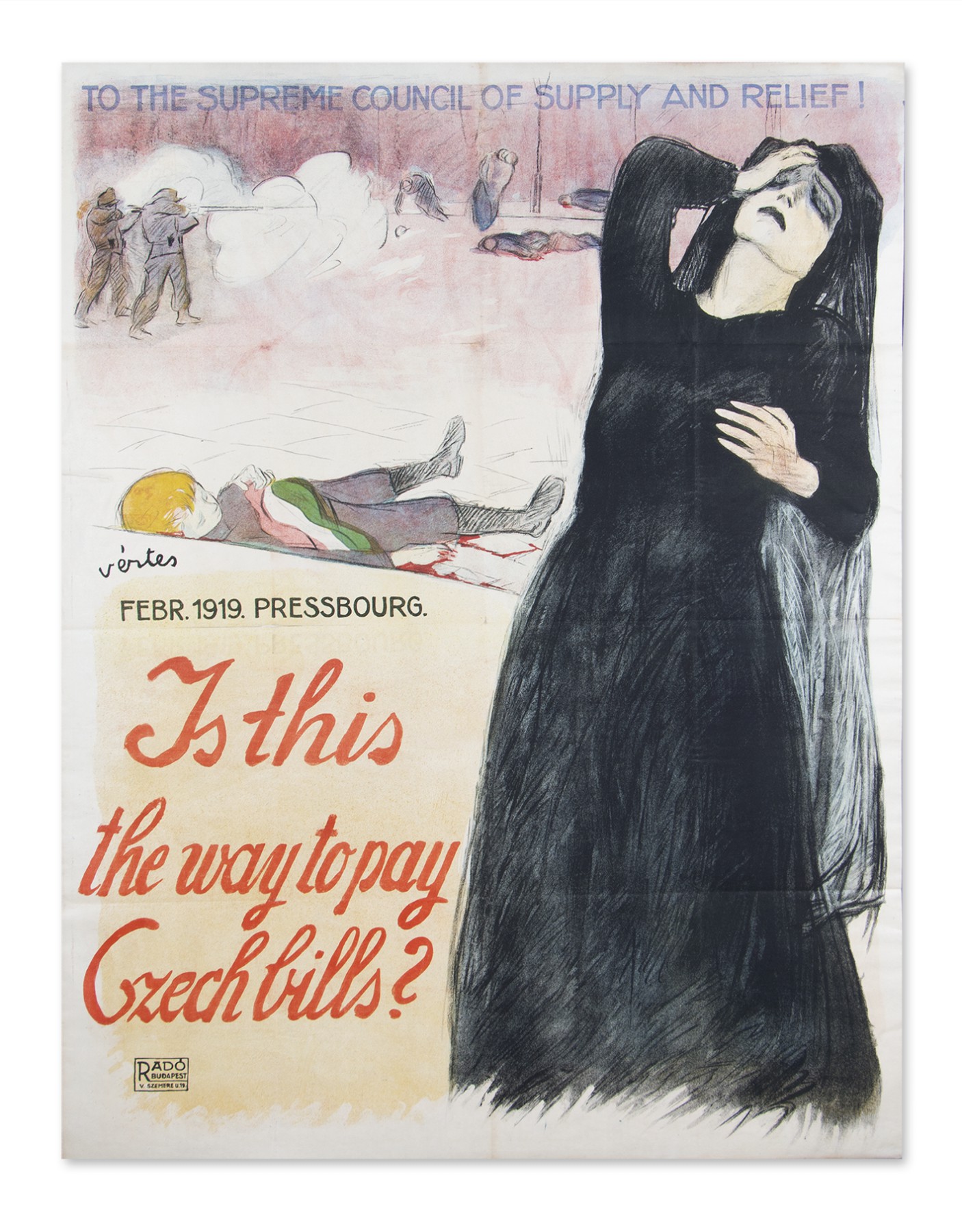 [1919. február] Budapest Radó [Jenő nyomda] Nagyméretű színes kőnyomatos politikai falragasz. A Tanácsköztársaság idején, 1919 első hónapjaiban, az Országos Propaganda Bizottság kiadásában jelentek meg az első, területi megszállások ellen tiltakozó kiadványok . A külföldi közvélemény felvilágosítására készült Vértes Marcell „Is this the way to pay Czech bills?” angol feliratú, képes falragasza, amely a magyar területeket megszállók zsarnokságára és az ártatlan áldozatokra kívánta a figyelmet ráirányítani. Az Országos Propaganda Bizottság megbízásából a művész egy tragikus pozsonyi eseményt tárt a közvélemény elé. 1919. február 12-én a megszállt városban szociális követelések miatt összegyűlt több ezer fegyvertelen tiltakozóra a Cseh Légió katonái tüzet nyitottak, majd szuronyokkal feloszlatták a tömeget. Az incidensnek több száz sérültje és kilenc halálos áldozata volt, köztük egy 14 éves fiú. Vértes plakátján a földön fekvő fiút édesanyja siratja, a megrendítő jelenetre a háttérben felvázolt sortűz ad magyarázatot. (Tóth Orsolya: Plakátok az utcákon, 1918–1921) Reprodukálva a 47. oldalon. Rendkívül ritka! Az általunk átvizsgált nemzetközi és hazai árverési adatbázisokban nem találtuk nyomát. Kisimítva, az egykori hajtások mentén két aprócska lyuk, professzionálisan javítva. S: 126×95 cm. A striking large poster by Marcell Vértes. Government propaganda for the safeguarding of Hungary’s territory was directed during these months by the National Propaganda Committee and the League for the Defence of Hungary’s Territorial Political posters were published by the National Propaganda Committee and appeared in the early months of 1919. Marcell Vértes’s poster with the inscription in English ‘Is this the way to pay Czech bills?’ was made to raise awareness among the public abroad. It wished to draw attention to violent behavior by those occupying Hungarian territories and to the innocent victims. The event referred to on the placard took place in Pozsony (now Bratislava, Slovakia) on 12 February 1919, when soldiers of the Czech Legion fired on a crowd of unarmed protesters. Among the nine people killed was a 14-year-old boy. Extremely rare, we could not trace it in any auction records database. Well-preserved, but with two professionally restored tiny holes at the center.