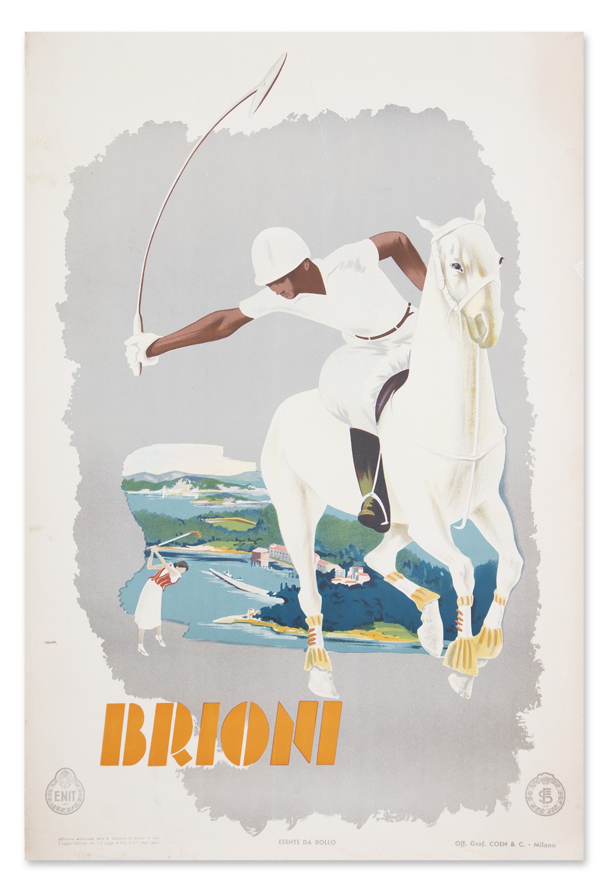 1937 Milano Coen & C ENIT Travel Poster Brioni Italy Polo Sailing Golf Sport Design 1937. Milano Coen & C. M: 68x100 cm. Graf.: Ism. Színes, art deco, nagy méretű poster. Javítva. Original Vintage ENIT Travel Poster Brioni Italy Polo Sailing Golf Sport Design 1937 Milano Coen & C. S:68 x 100 cm. The designer is unknown. Colourful, large art deco travel poster. Small tears are skillfully restored, and minor losses on the right side are also restored.