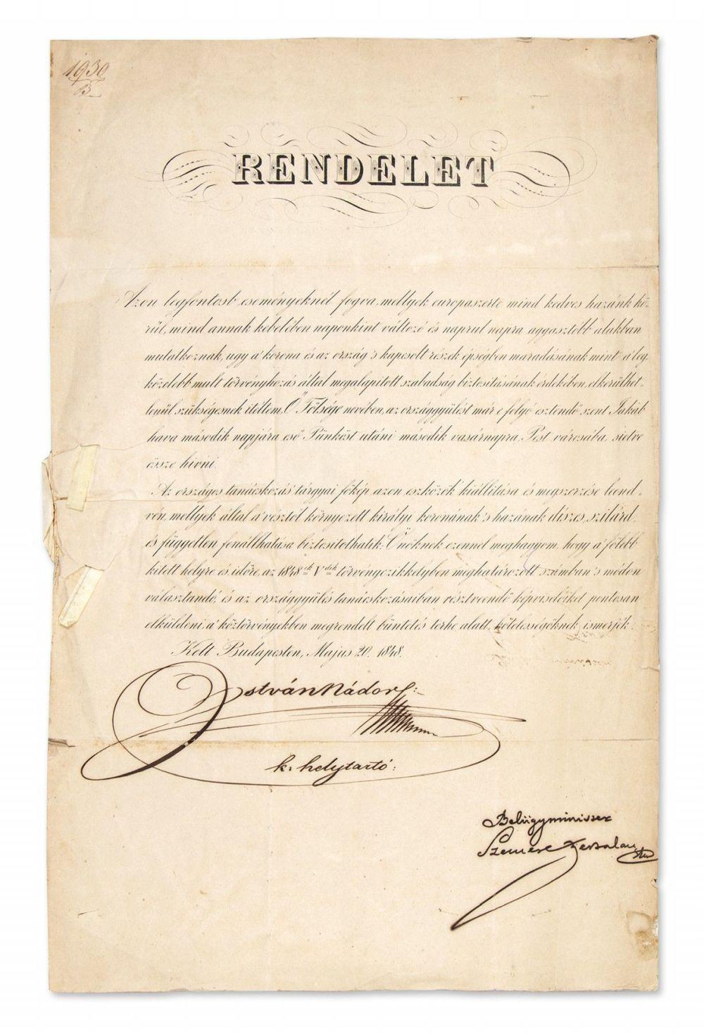 Egy ív félbehajtva, a litografált főszöveg alatt István nádor királyi helytartó és Szemere Bertalan belügyminiszter tintás aláírása. A több példányban nyomtatott és városoknak levélként megküldött rendelet versoján V. Ferdinánd papírfelzetes pecsétjével, autográf datálással, címzéssel, iktatószámmal.