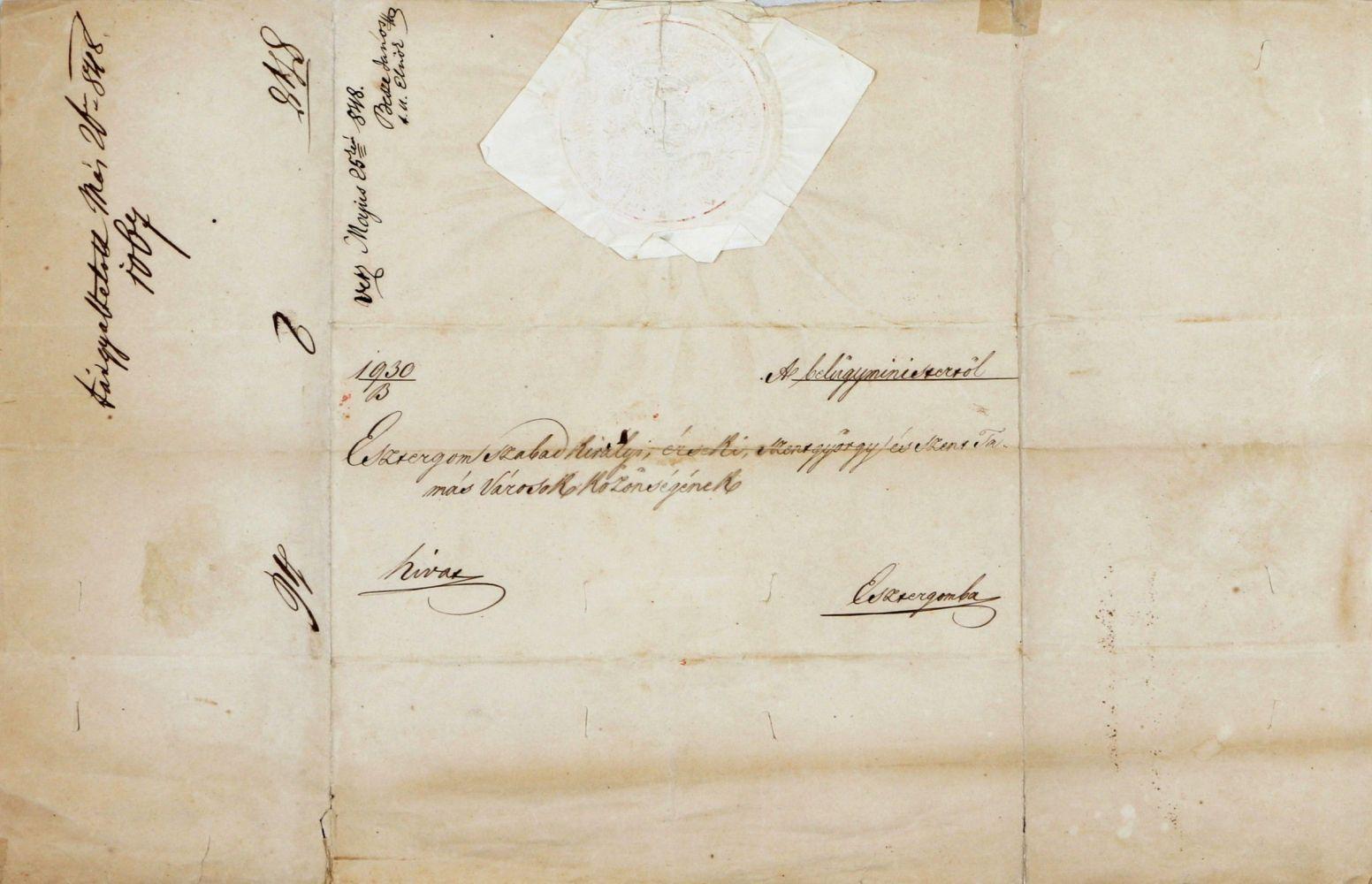"A belügyminisztertől Esztergom szabad királyi, érseki, Szentgyörgy és Szenttamás városok közönségének"