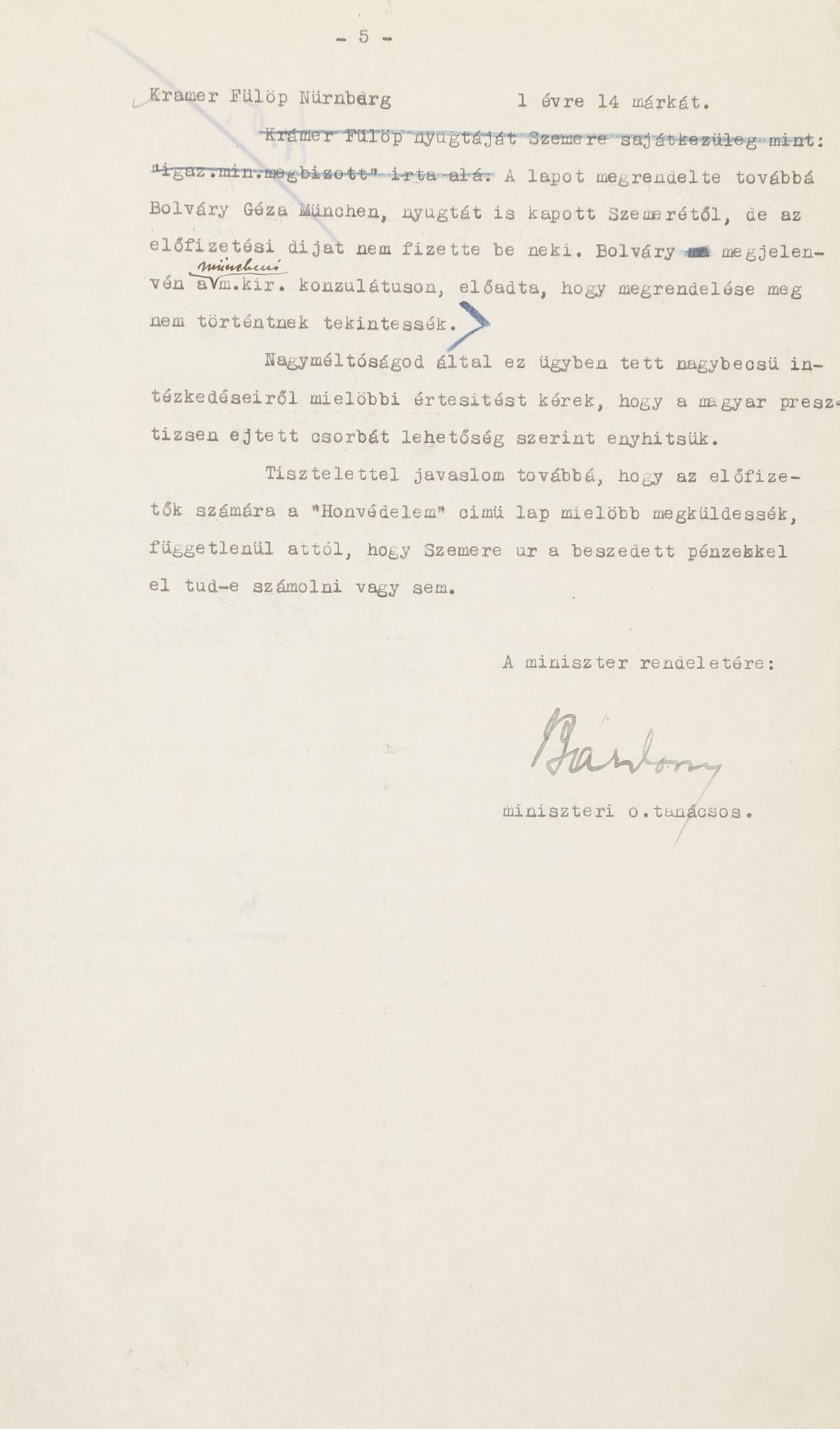 18. Bárdossy László (1890–1946) a Magyar Királyság 33. miniszterelnöke (1941. április 3. – 1942. március 7.). Bárdossy 1922-ben került a Külügyminisztérium sajtóosztályára, amelynek 1924-ben kinevezett vezetője lett. 1925. november 25-én kelt, Csáky Károly (1873–1945) honvédelmi miniszternek írt levelében mint miniszteri tanácsos részletesen beszámol egy Szemere István nevű hírlapíró különböző német nagyvárosokban a Honvédelem című lap nevében elkövetett szélhámosságairól. E szavakkal zárja sorait: „Nagyméltóságod ez ügyben tett nagybecsü intézkedéséről mielőbbi értesítést kérek, hogy a magyar presztizsen esett csorbát mielőbb enyhítsük.”