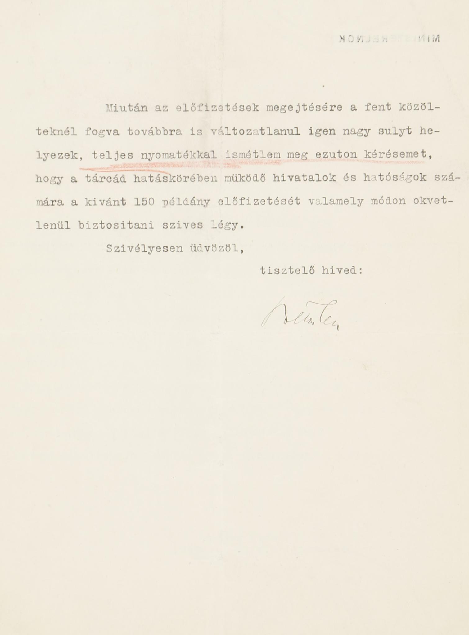 Gépirat, 1 folio két beírt oldal, a Miniszterelnök fejléces papírján, Bethlen István autográf aláírásával. A verson piros ceruzás aláhúzással.
