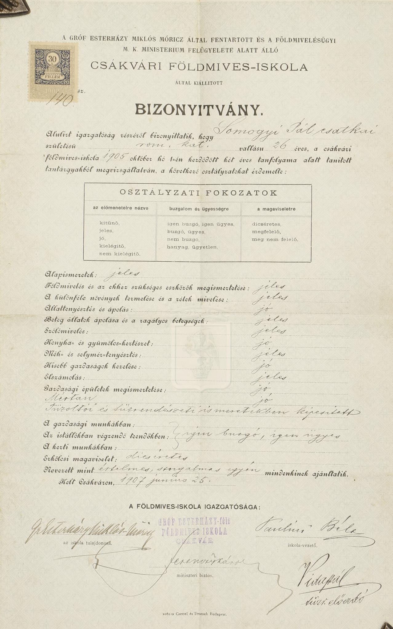7. Gróf Esterházy Móric (1881–1960), a Magyar Királyság 20. miniszterelnöke (1917. június 15. – augusztus 20.) aláírásával szentesíti az általa alapított és vezetett Csákvári Földműves Iskola Somogyi Pál nevére Csákváron 1907. június 25-én kiállított bizonyítványát.