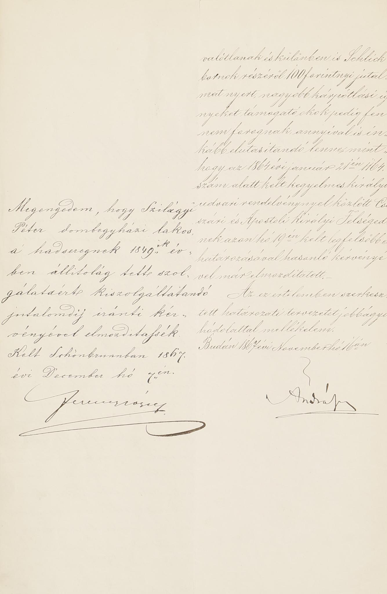 1. Gróf Andrássy Gyula (1823–1890), a Magyar Királyság 3. miniszterelnökének (1867. február 17. – 1871. november 14.) Budán 1867. november 16-án kelt levele gróf Lónyay Menyhérthez, a Magyar Királyság pénzügyminiszteréhez, majdani miniszterelnökéhez. Az iratban Andrássy előterjeszti Szilágyi Péter a hadseregnek nyújtott szolgálatáért kiérdemelt kárpótlási ügyét, melyet Ferenc József saját kezű jóváhagyása biztosít.
