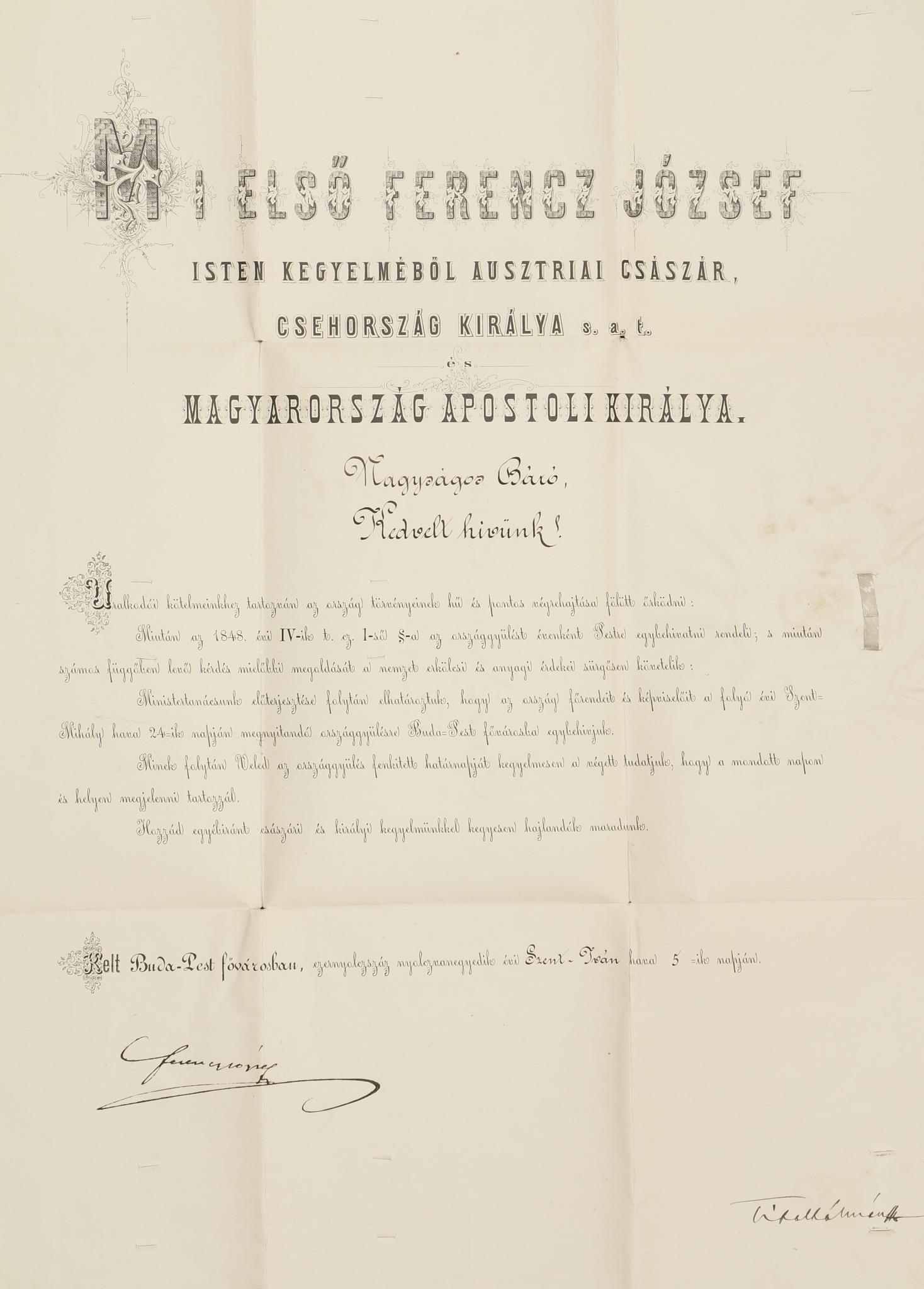 Kézirat, 4 folio 3 beírt oldal Ferenc József és Andrássy Gyula autográf aláírásával.