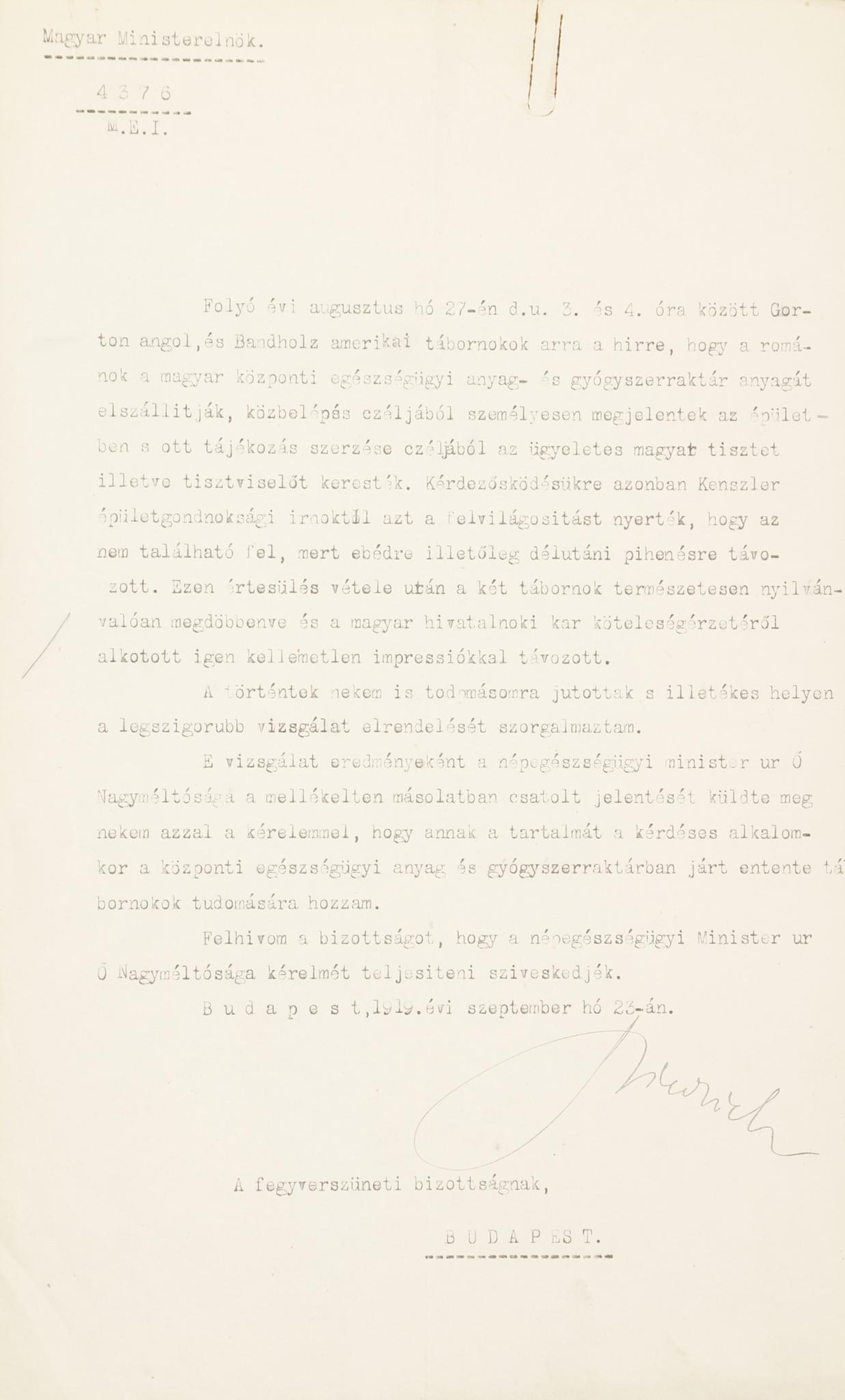 Friedrich István (1883–1951) miniszterelnök a fegyverszüneti bizottságnak címzett levelében ismerteti azt a kellemetlen ügyet, amikor a román megbízottak a magyar központi egészségügyi anyag- és gyógyszerraktár anyaga elszállítását tervezték, ám az ennek megakadályozására érkező Reginald Gorton angol és Harry Hill Bandholz amerikai tábornokok dolgavégezetlenül távoztak, mert az ügyeletes tiszt ebédszüneten volt. Friedrich kéri a bizottságot, hogy a népegészségügyi miniszter által az ügyben elrendelt vizsgálat eredményét ismertesse az ügyben érintett entente tábornokokkal.