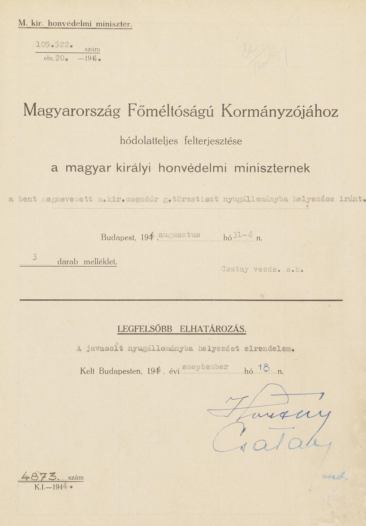 23. Csatay Lajos magyar királyi honvédelmi miniszter által Magyarország Főméltóságú Kormányzójához intézett augusztusi felterjesztése, melyben Rieger Ignác m. kir. gazdászati alezredes nyugállományba helyezését kéri. A felterjesztés alatt található jóváhagyó legfelsőbb elhatározást Horthy Miklós Magyarország kormányzója (1920. március 1. – 1944. október 16.) és Csatay Lajos írta alá 1944. szeptember 18-án, Budapesten.