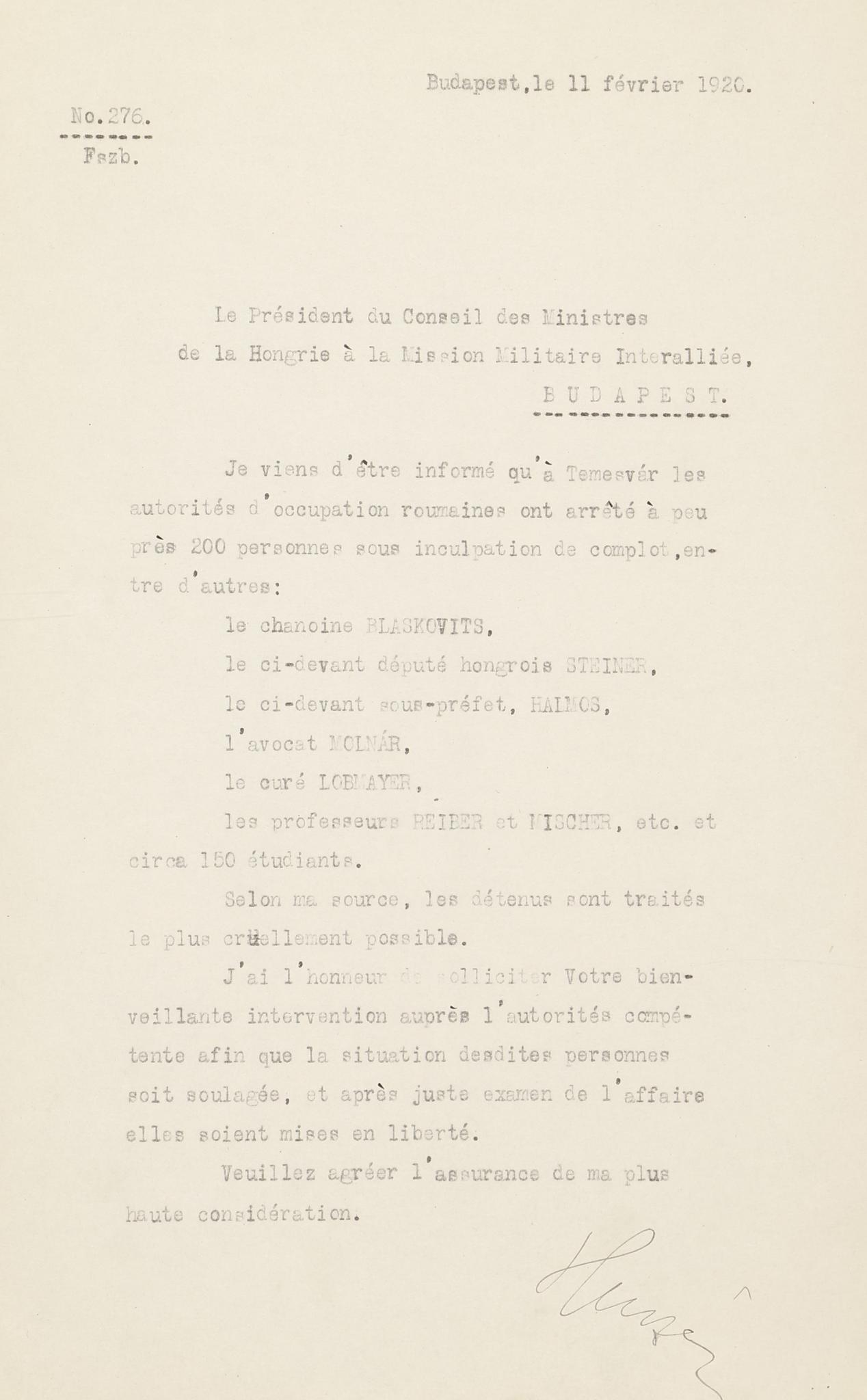 13. Huszár Károly (1882–1941), Magyarország miniszterelnökének (1919. november 24. – 1920. március 15.) 1920. február 11.-én, a Szövetséges Katonai Misszióhoz írt levelében kifejti, hogy tudomására jutott, miszerint Temesváron a román megszálló csapatok összeesküvés vádjával mintegy 200 embert tartóztattak le és tartanak fogva durva körülmények között. A miniszterelnök kéri a méltányos bánásmódot, valamint, az igazságos vizsgálat lefolytatása után, a foglyok szabadon bocsátását.