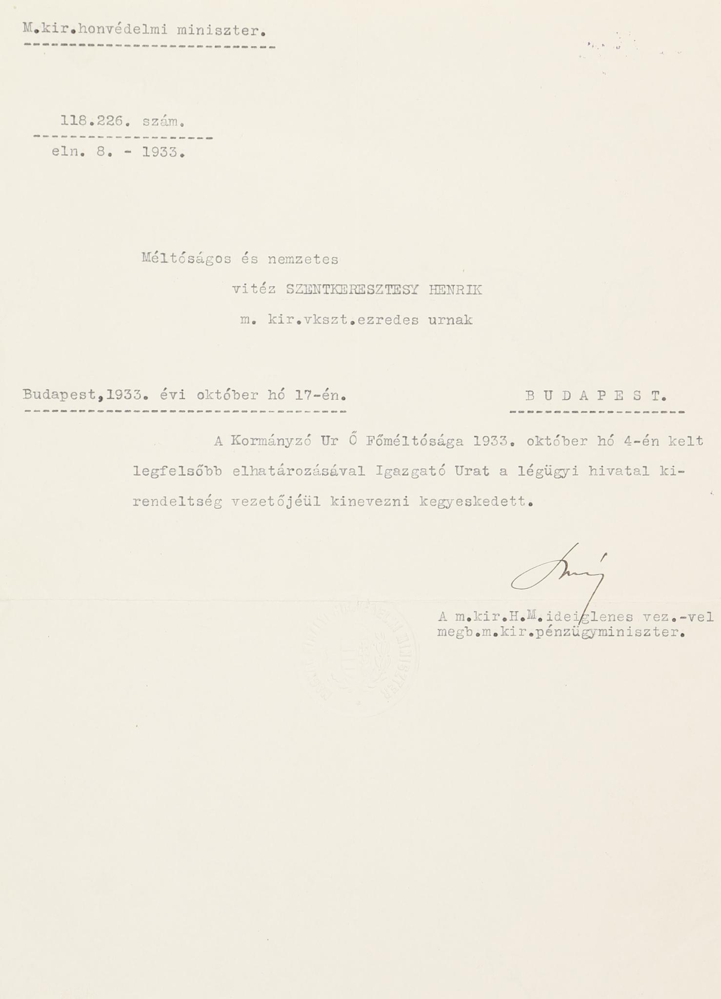 17. Imrédy Béla (1891–1946), a Magyar Királyság 31. miniszterelnöke (1935. január 6. – 1938. május 14.), pénzügyminiszteri funkciójában a Budapesten 1933. október 17-én kelt levelében Vitéz Szentkeresztesy Henriket a légügyi hivatal kirendelt vezetőjének nevezi ki.