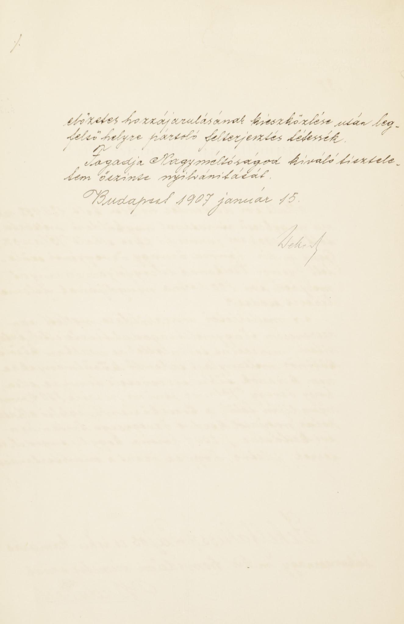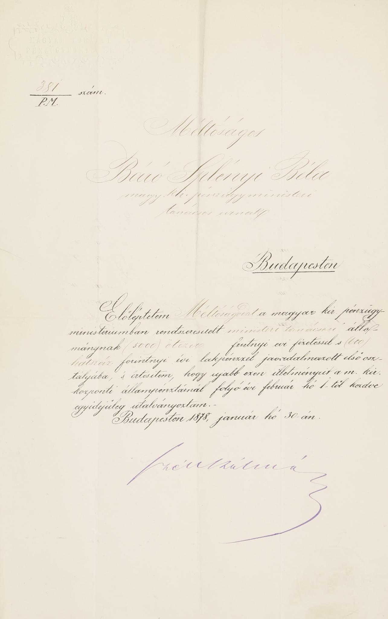 Kézirat, 1 folio egy beírt oldal, a Magyar Királyi Pénzügyminiszter fejléces, papírfelzetes viaszpecséttel, bélyeggel ellátott papírján, Széll Kálmán autográf aláírásával.