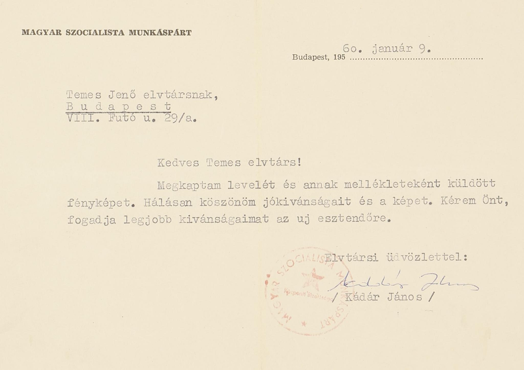 27. Kádár János (1912–1989), a Magyar Népköztársaság Minisztertanácsának 6. majd 8. elnöke (1956. november 4. – 1958. január 28. és 1961. szeptember 13. – 1965. június 30.), a Magyar Népköztársaság államminisztere (1958. január 28. – 1961. szeptember 13.) Budapesten, 1960. január 9-én kelt levele „Temes Jenő elvtársnak. Kedves Temes elvtárs! Megkaptam levelét és annak mellékleteként küldött fényképet. Hálásan köszönöm jókívánságait és a képet. Kérem Önt, fogadja legjobb kívánságaimat az uj esztendőre. Elvtársi üdvözlettel: Kádár János.”