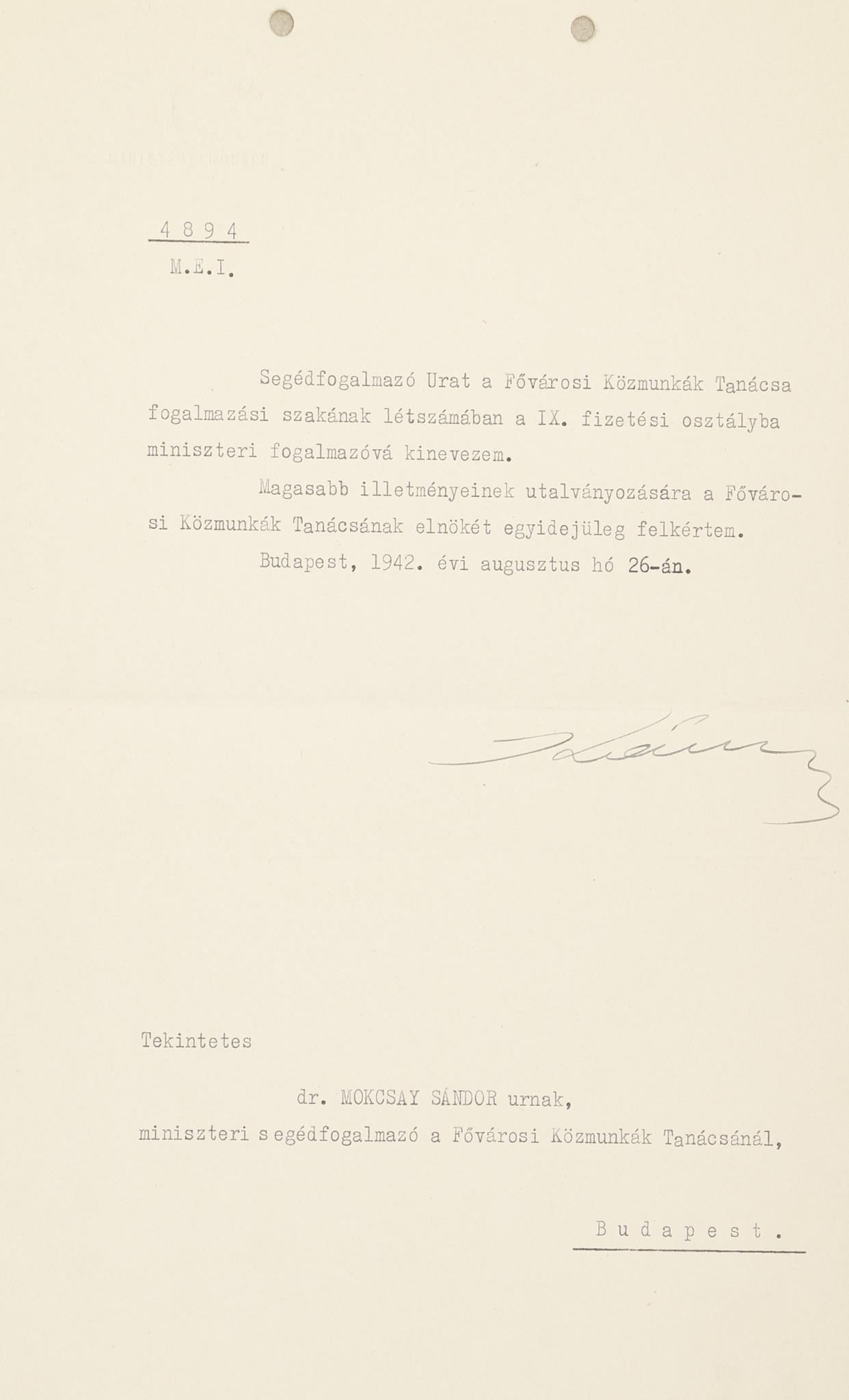 19. Kállay Miklós (1887–1967), a Magyar Királyság 34. miniszterelnöke (1942. március 9. – 1944. március 22.), Budapesten 1942. augusztus 26-án kelt levelében miniszteri fogalmazóvá lépteti elő dr. Mokcsay Sándort, a Fővárosi Közmunkák Tanácsa miniszteri segédfogalmazóját.