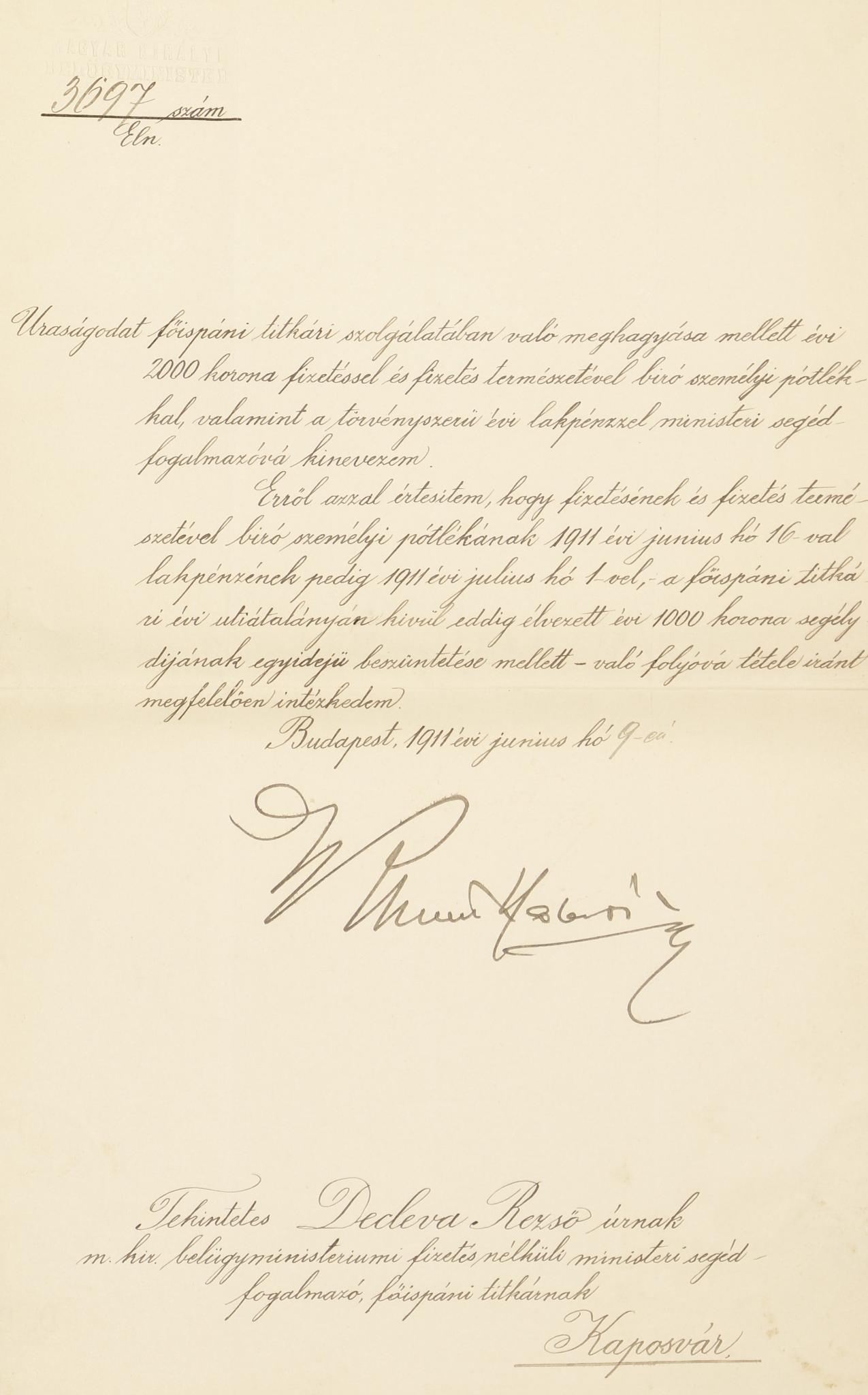 10. Gróf Khuen-Héderváry Károly (1849–1918), a Magyar Királyság 13. miniszterelnöke (1910. január 17. – 1912. április 22.), Budapesten 1911. június 9-én kel levelében kinevezi Decleva Rezsőt (1881–?), a magyar királyi belügyminisztérium fizetés nélküli miniszteri segédfogalmazóját és főispáni titkárt miniszteri segédfogalmazóvá.