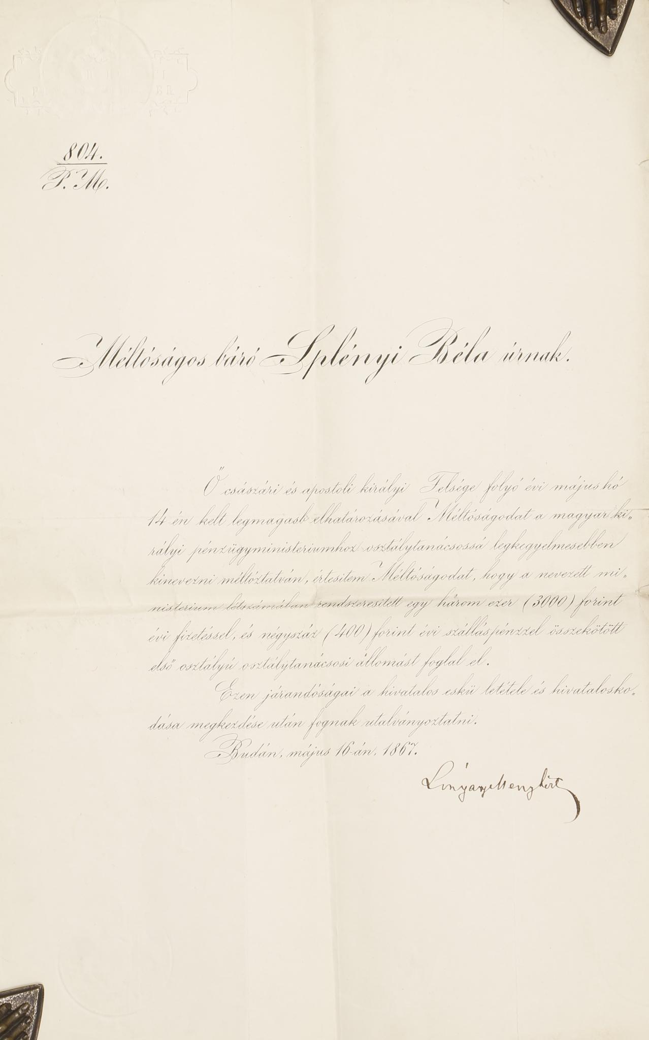 2. Gróf Lónyay Menyhért (1822–1884), a Magyar Királyság 4. miniszterelnöke (1871. november 14. – 1872. december 4.) Budán, 1867. május 16-án kelt levelében mint az Andrássy-kormány pénzügyminisztere értesíti a címzettet, báró Splény Bélát (1819–1899) pénzügyminiszteri osztálytanácsossá történő kinevezéséről.