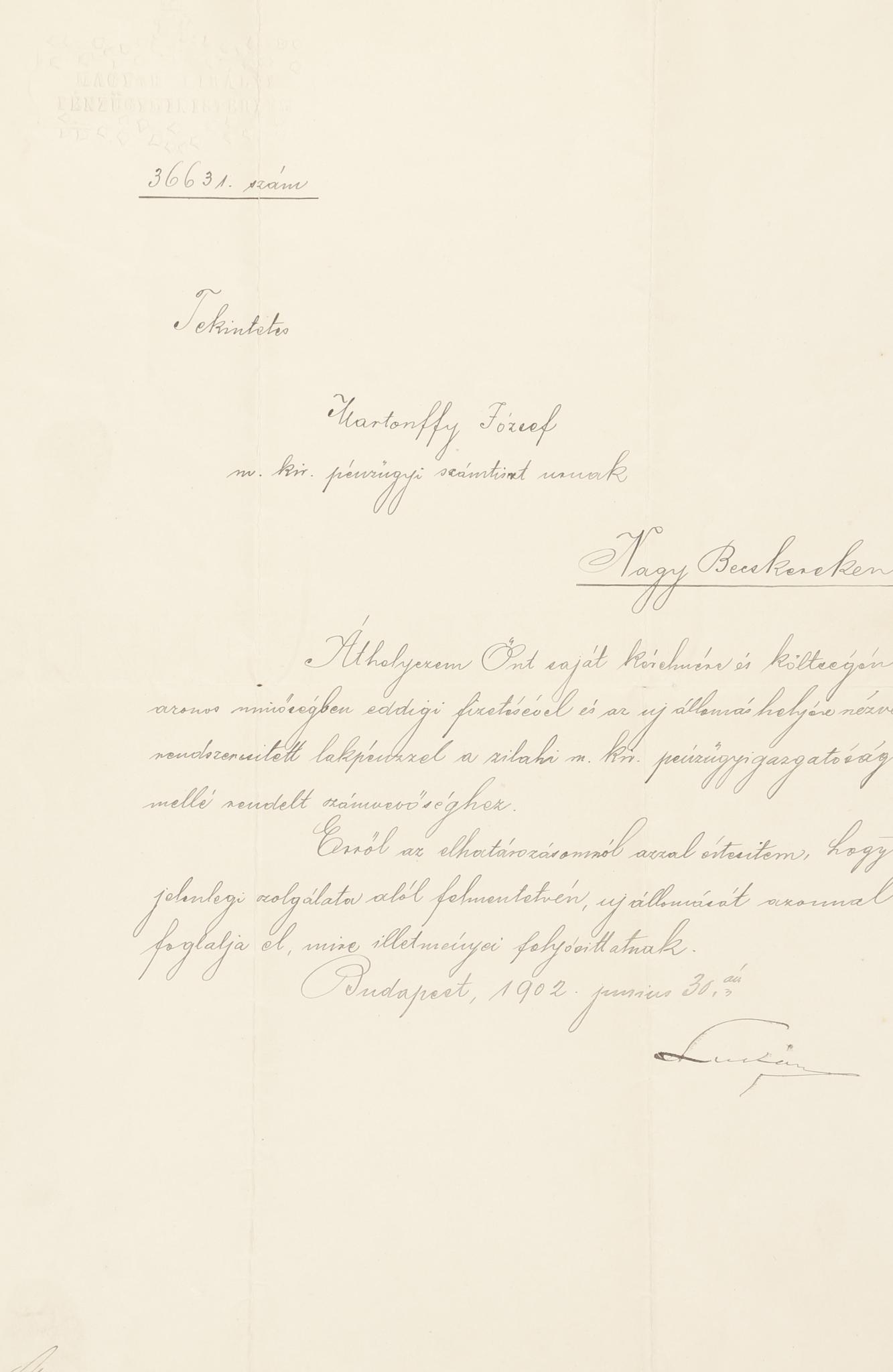 11. Lukács László (1850–1932) pénzügyminiszter, később a Magyar Királyság 18. miniszterelnöke (1912. április 22. – 1913. június 10.), Budapesten 1902. június 30-án kelt levele Martonffy József m. kir. pénzügyi számtisztnek saját kérelmére történt hivatali áthelyezéséről.