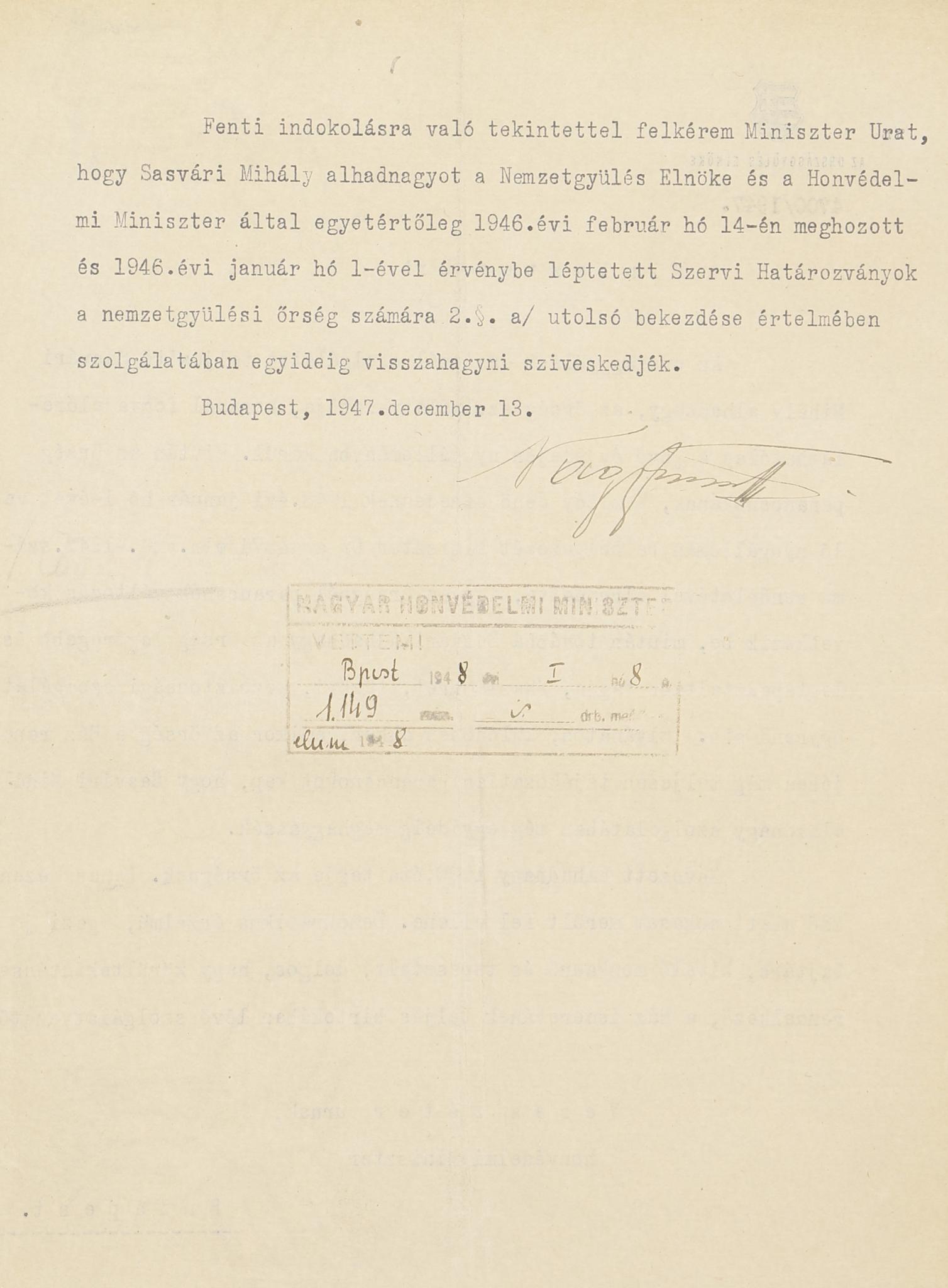 26. Nagy Imre (1896–1958), a Magyar Népköztársaság minisztertanácsának 3. (1953. július 4. – 1955. április 18.) majd 5. (1956. október 24. – november 12.) elnöke, ekkor az MKP, majd az MDP Központi vezetőségének és a Politikai Bizottságnak tagjaként Veres Péter honvédelmi miniszterhez Budapesten 1947. december 13-én írt levele, melyben a koránál fogva nyugállományba készülő Sasvári Mihály alhadnagy szolgálatban maradását kéri.
