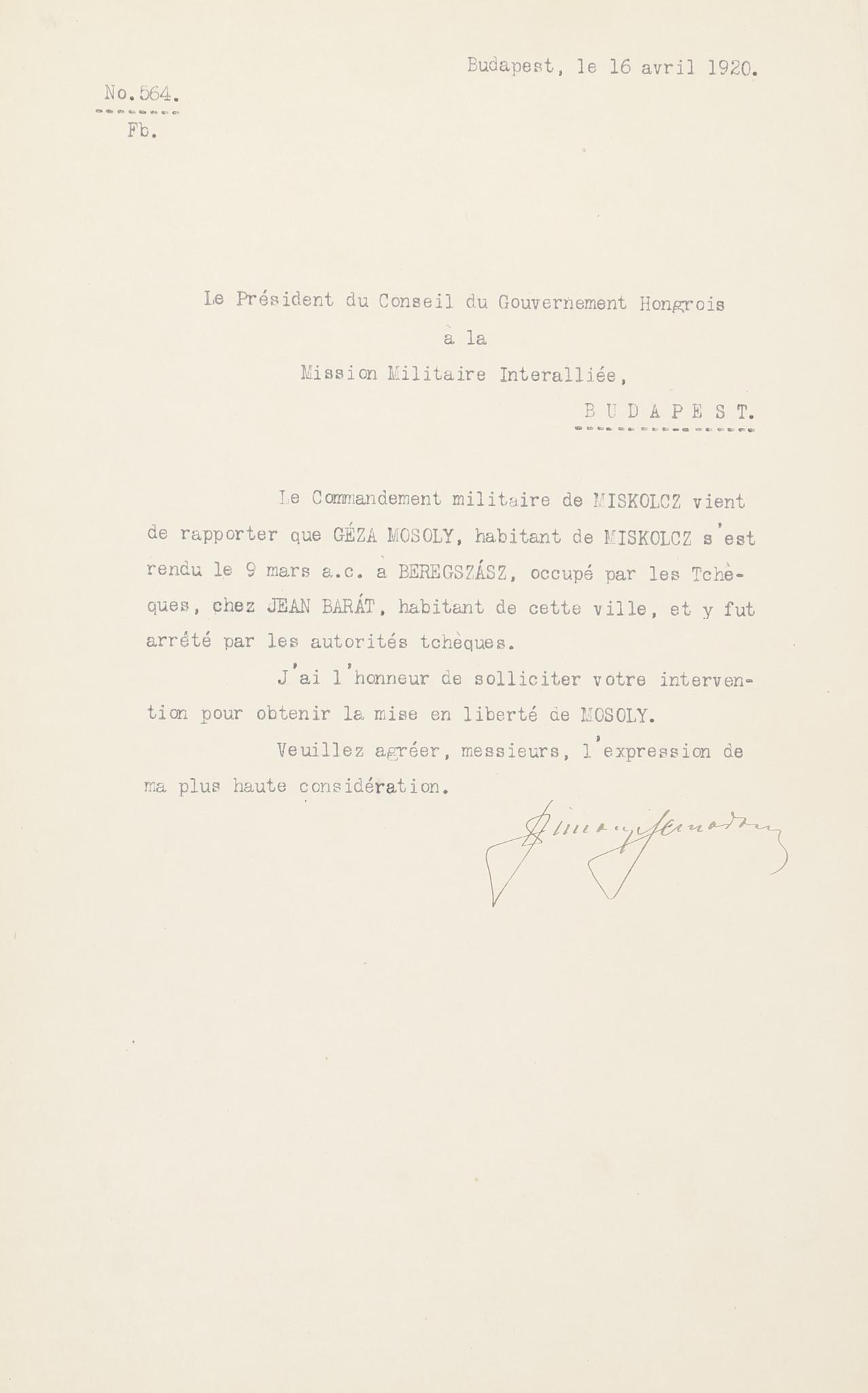 14. Simonyi-Semadam Sándor (1864–1946), a Magyar Királyság 25. miniszterelnöke (1920. március 15. – 1920. július 19.) 1920. április 16-án kelt levele a Szövetséges Katonai Misszióhoz. A miskolci katonai vezetés tudatta, hogy a cseh hatóságok letartoztatták Mosoly Géza miskolci lakost, amikor az barátját Beregszászon meglátogatta. A miniszterelnök arra kéri az 1919. augusztus 6-án felállt Szövetséges Katonai Missziót – amelynek fő feladata a román seregek távozásának felügyelete volt –, hogy avatkozzanak közbe a fogoly elengedése végett. Az angol–francia–olasz–amerikai négyhatalmi tábornoki kar Harry Hill Bandholtz, Reginald Gorton, Jean César Graziani és Ernesto Mombelli tábornokokból állt.