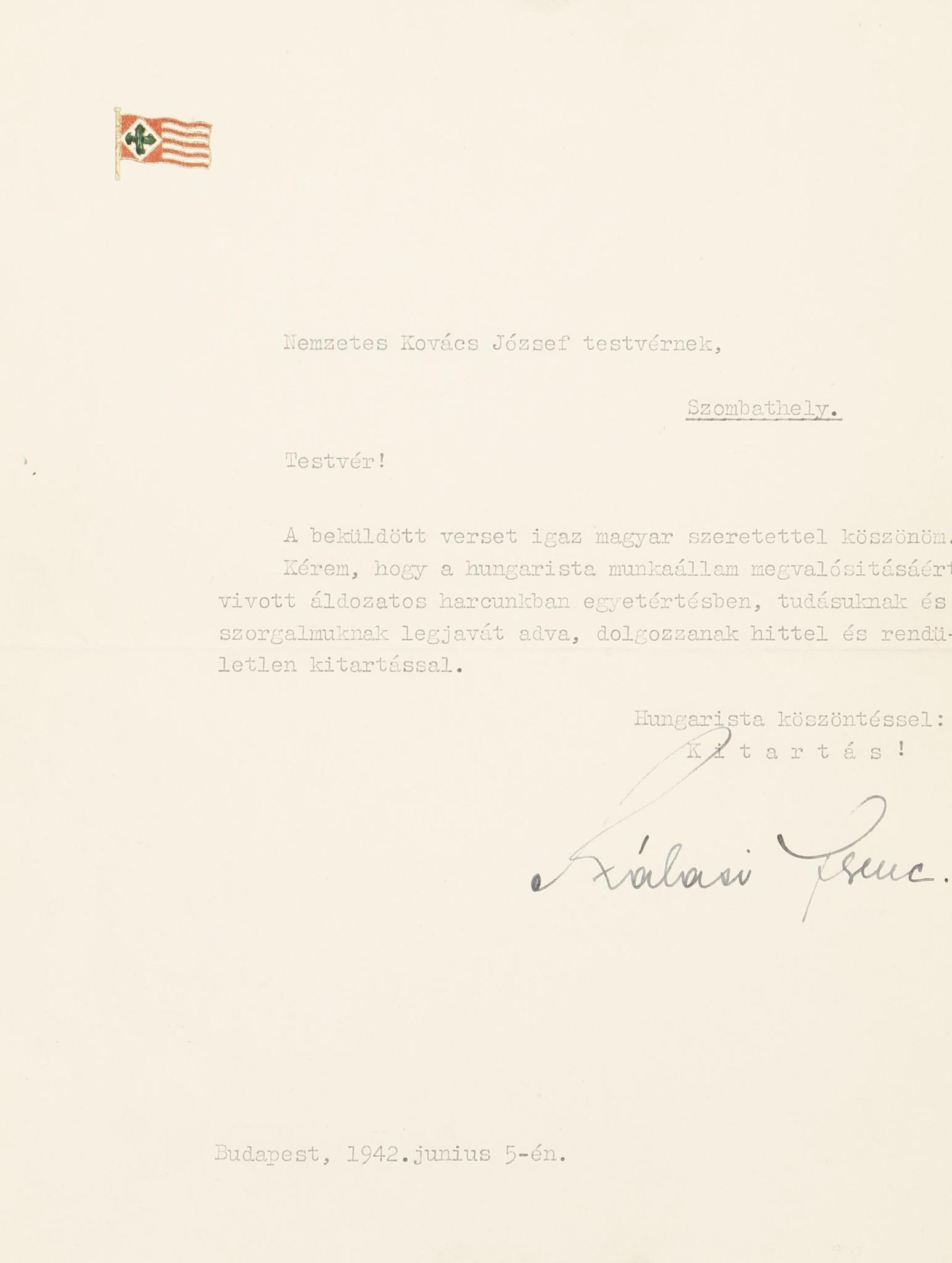22. Szálasi Ferenc (1897–1946), Magyarország nemzetvezetője (1944. október 16. – 1945. március 28.), 1942. június 5-én Budapesten kelt levelében így üdvözli a címzettet: „Nemzetes Kovács József testvérnek. Testvér! A beküldött verset igaz magyar szeretettel köszönöm. Kérem, hogy a hungarista munkaállam megvalósításáért vívott áldozatos harcunkban egyetértésben, tudásunknak és szorgalmunknak legjavát adva, dolgozzanak hittel és rendületlen kitartással. Hungarista köszöntéssel: Kitartás! Szálasi Ferenc”