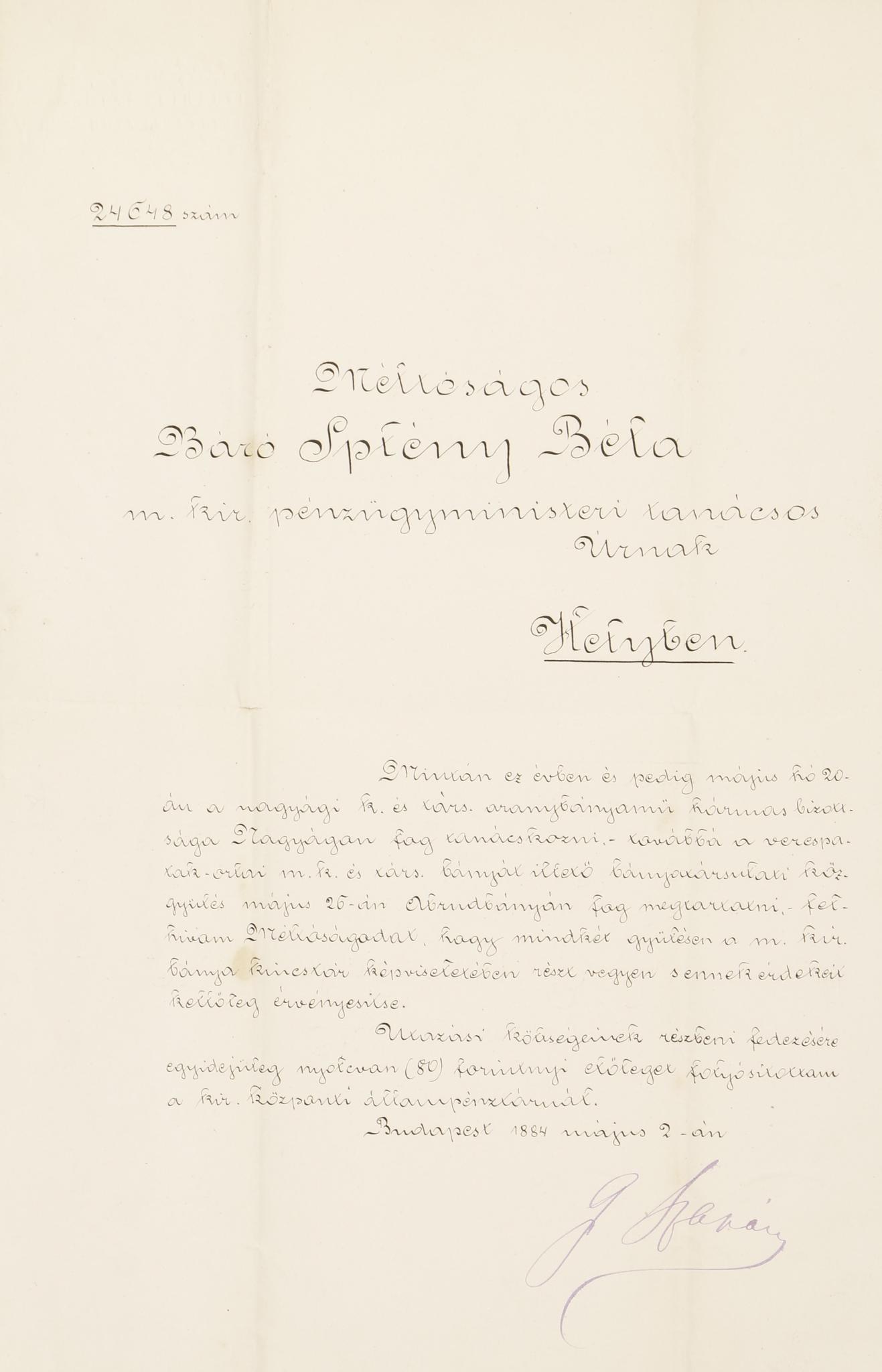 6. Gróf Szapáry Gyula (1832–1905), Magyarország 9. miniszterelnöke (1890. március 13. – 1892. november 17.), a levél keltekor (Budapest, 1884. május 2.) mint pénzügyminiszter (1878–1887) utasítja báró Splény Bélát, hogy vegyen részt a nagyági k. és társ. aranybányamű hármas bizottságának és verespatak-orlai m.k. és társ. bányát illető bányatársulati gyűlésén, valamint hogy méltóképpen képviselje és a m. kir. bánya kincstár érdekeit.