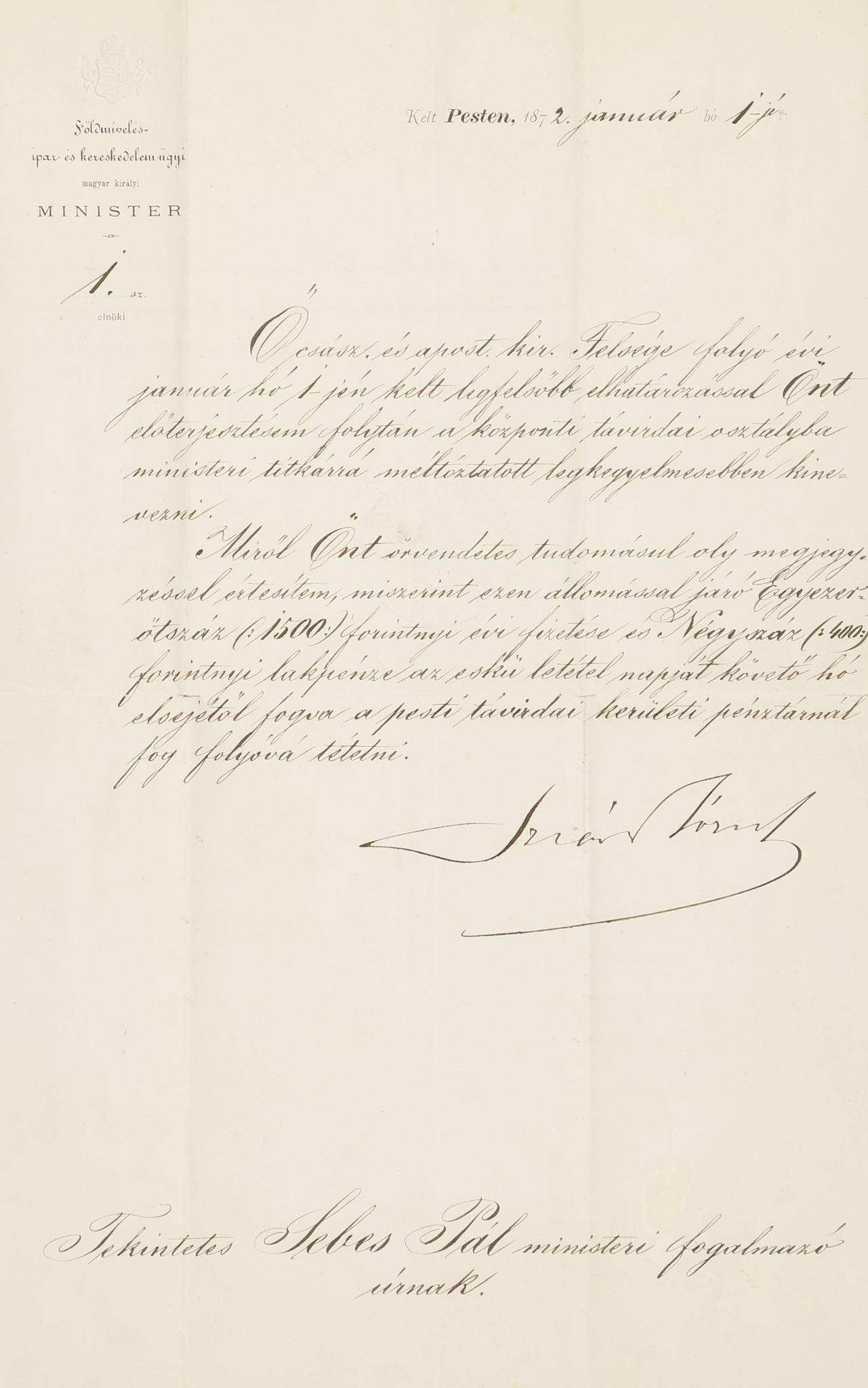 3. Szlávy József (1818–1900), a Magyar Királyság 5. miniszterelnöke (1872. december 4. – 1874. március 21.), Pesten 1872. január 1-én kelt levelében mint Földművelés-, ipar- és kereskedelemügyi miniszter arról tájékoztatja Sebes Pál miniszteri fogalmazót, hogy kinevezik a központi távirdai osztályba miniszteri titkárrá.