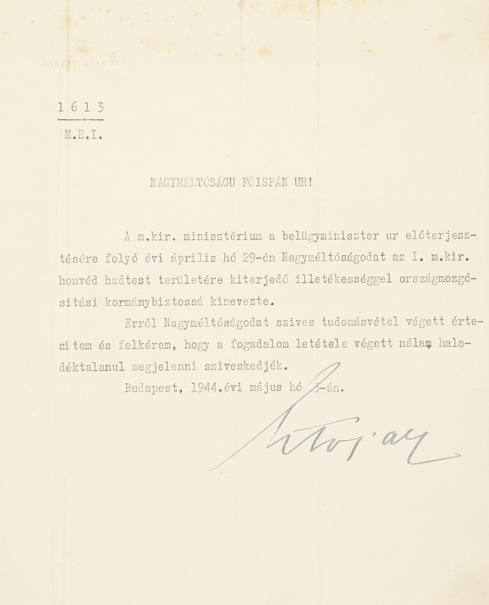 21. Sztójay Döme (1883–1946) miniszterelnöksége idejéből származik a címzett („Nagyméltóságú Főispán Úr”) az I. m. kir. honvéd hadtest területére kiterjedő országmozgósítási kormánybiztossá történő kinevezése és minisztériumba rendelése.