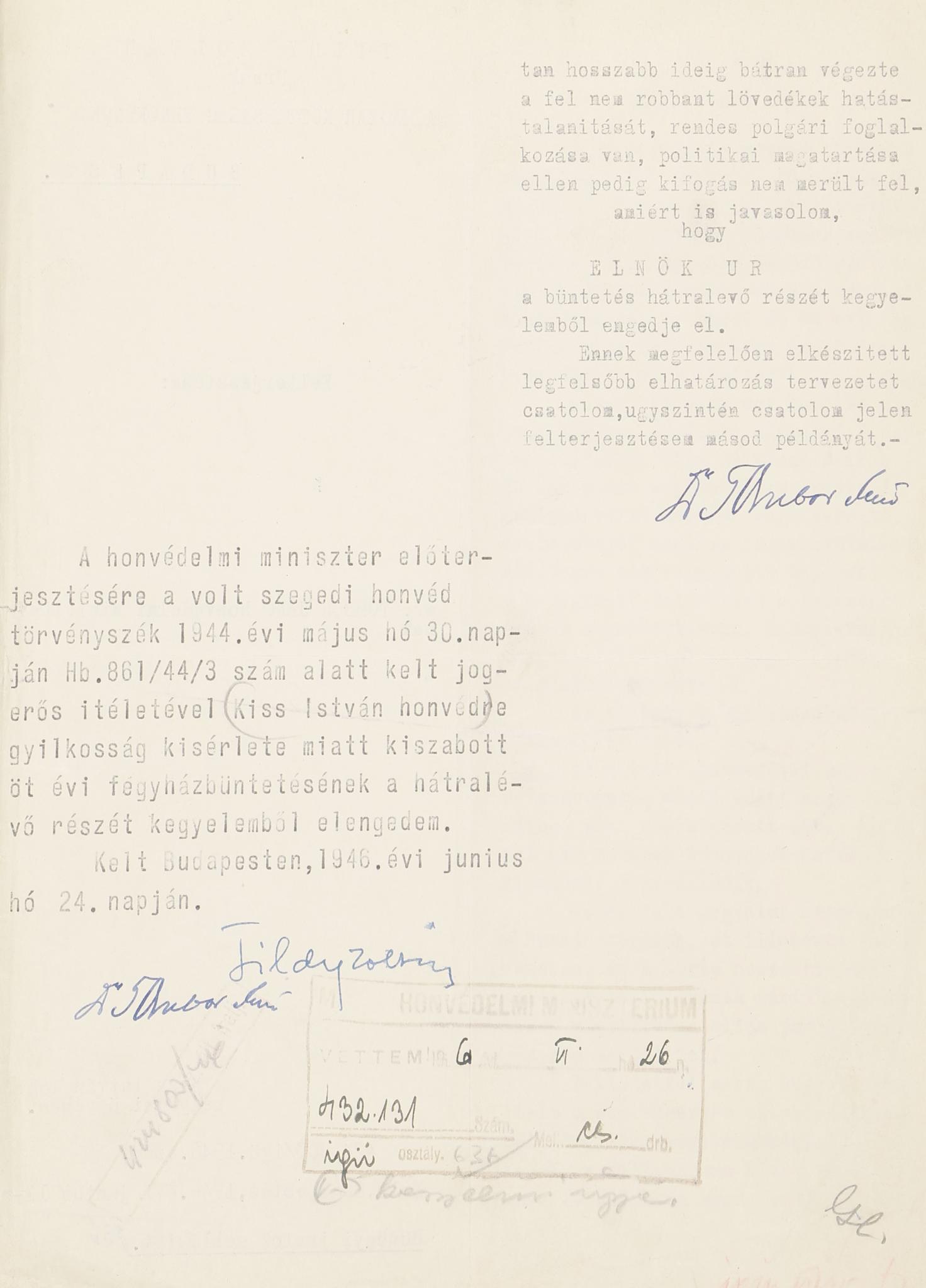 24. Tombor Jenő honvédelmi miniszter Budapesten 1946. június 24-én kelt felterjesztése Tildy Zoltán (1889–1961) akkori köztársasági-, majdani miniszterelnökhöz (1945. november 15. – 1946. február 1.) Kiss István honvéd kegyelmi ügyében. Kiss előre megfontolt szándékkal felrobbantotta feleségét, aki ezt túlélte. Kiss büntetését félbeszakították, mert vállalkozott a fel nem robbant lövedékek hatástalanítására. Tombor erre hivatkozva, valamint arra való tekintettel, hogy Kiss rendes polgári foglalkozással rendelkezik és politikai magatartása ellen sem merült fel kifogás kéri Tildyt, hogy kegyelemből engedje el Kiss büntetésének hátralévő részét.