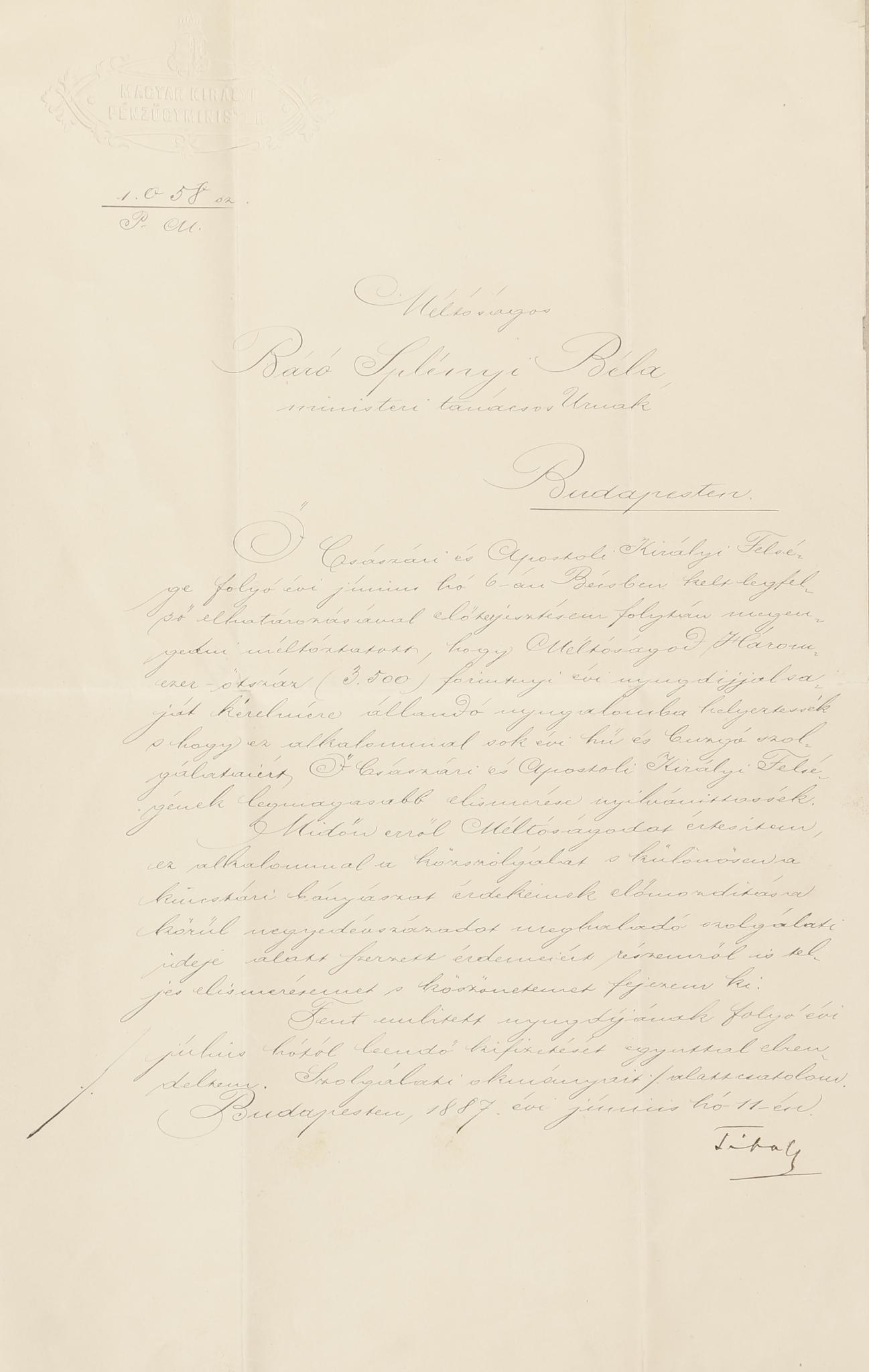 Kézirat, 1 folio egy beírt oldal, a Magyar Királyi Pénzügyminiszter fejléces, papírfelzetes viaszpecséttel ellátott papírján, Tisza Kálmán autográf aláírásával.