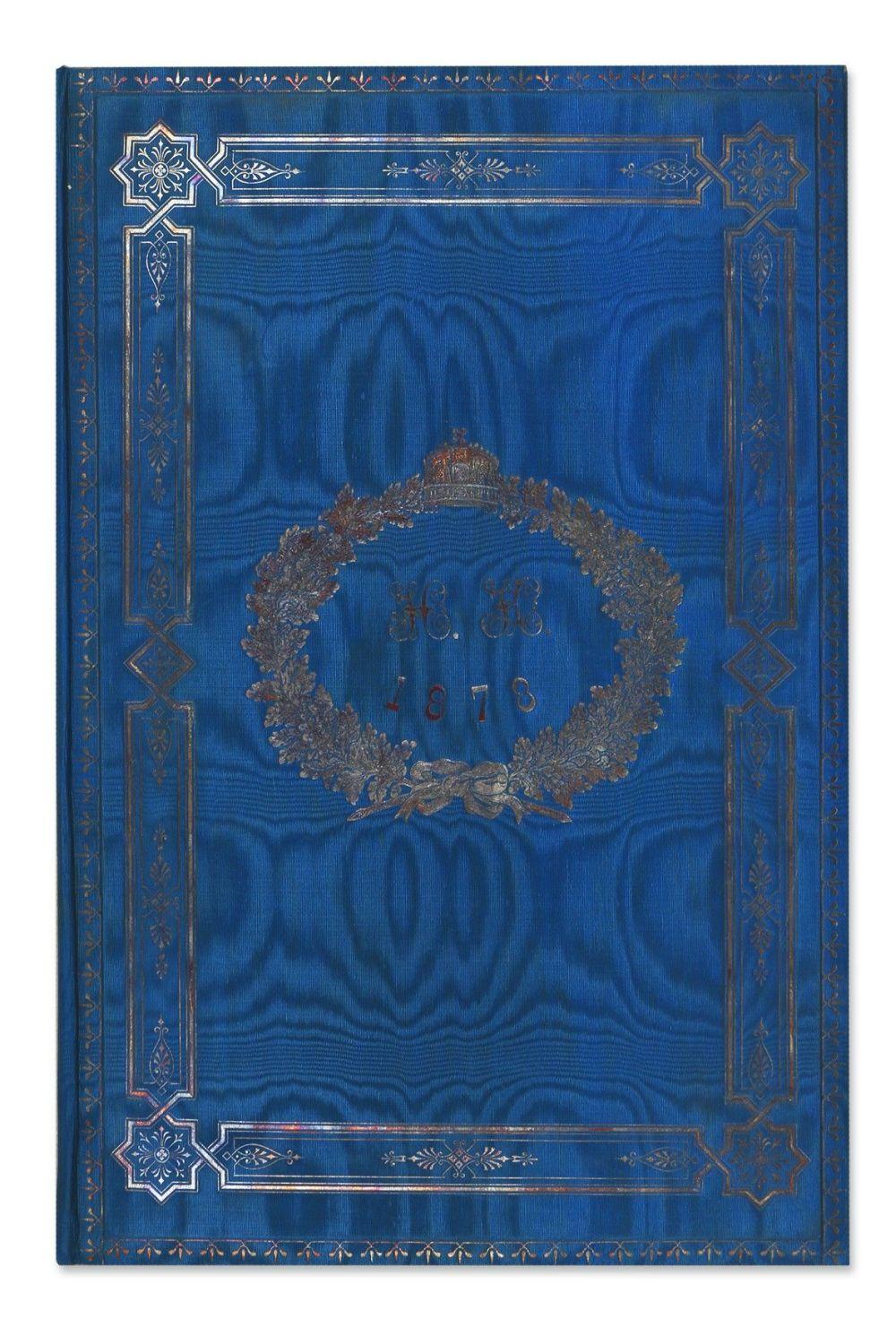 Papír, 12 fol. Díszesen aranyozott, kék, moiré selyem boritású mappában, a táblák belső borításán is selyemmel bélelve. 5 levél aranyozott litografált díszkerettel. Nagyon szépen megőrzött példány.
