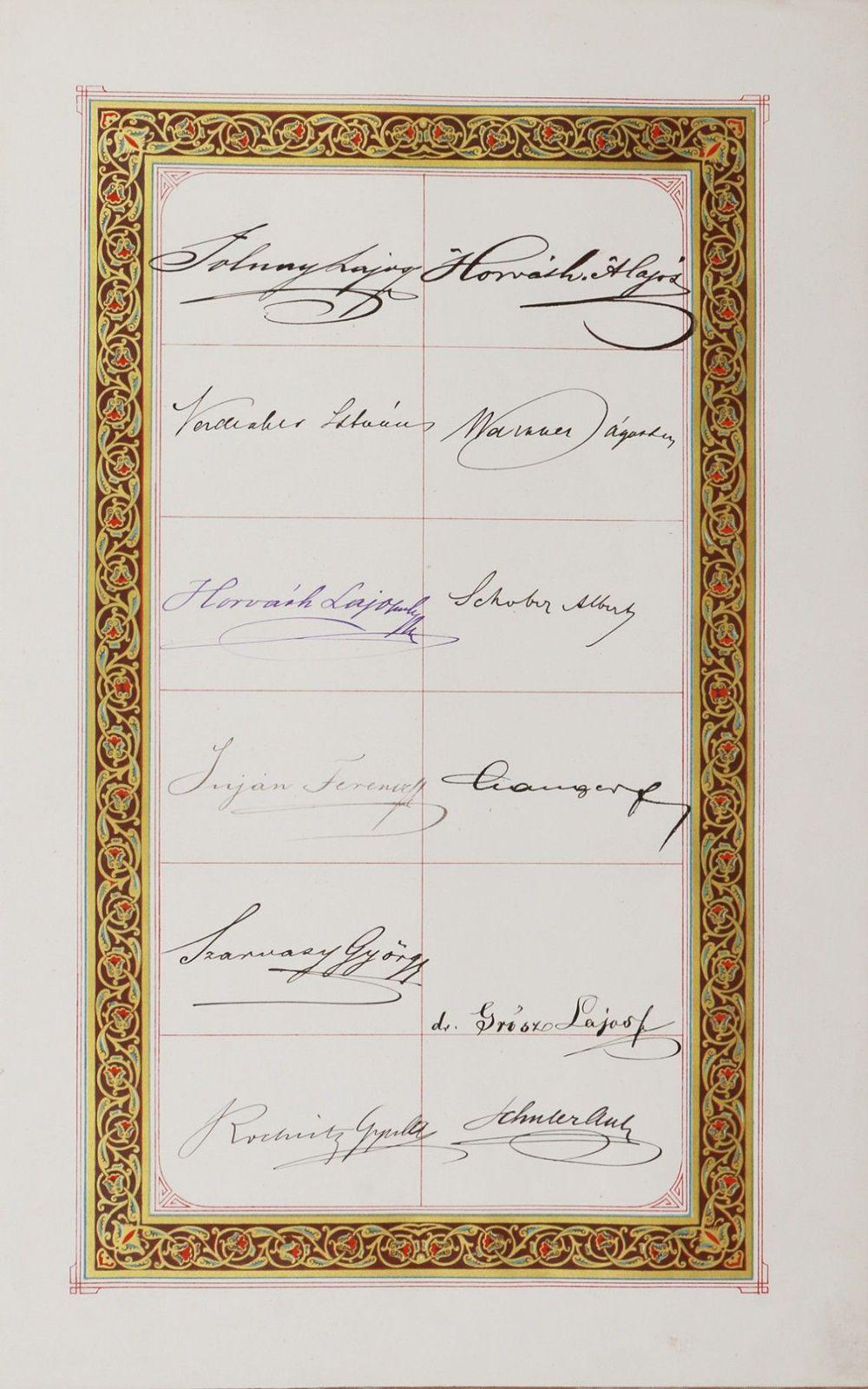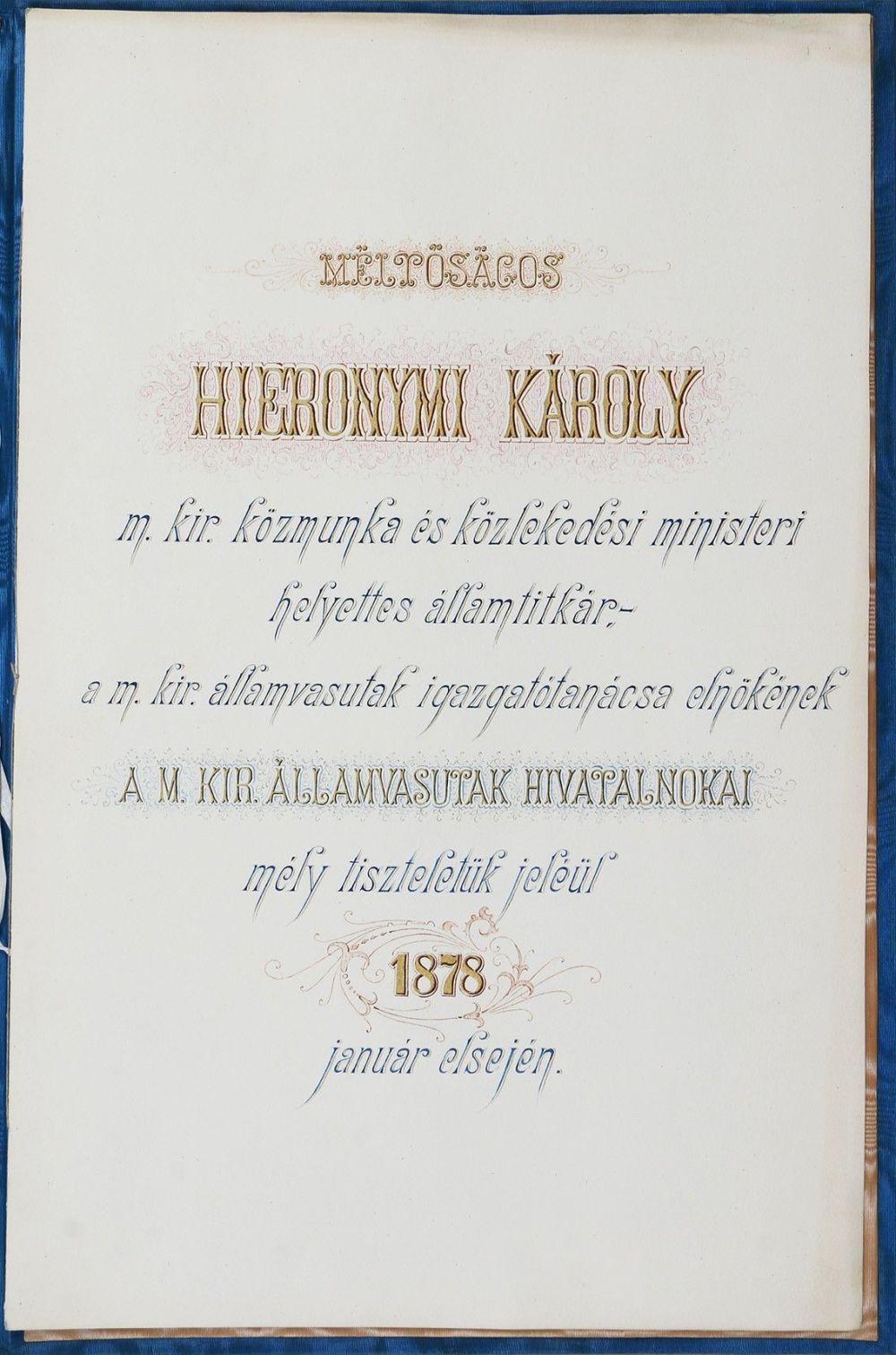 A Magyar Királyi Államvasutak hivatalnokainak aláírásokkal ellátott üdvözlőlapja Hieronymi Károly politikus, ekkor (1874-től) közmunka- és közlekedésügyi helyettes államtitkár, később belügyminiszter (1892–1895), majd kereskedelemügyi miniszter (1903–1905, 1910–1911) részére. Az aláírók sorában – összesen tizenhat oldalon – szerepel többek között Tolnay Lajos MÁV-igazgató, Grósz (1878-tól Csatáry) Lajos MÁV-főorvos és más vasúti tisztviselők: Szarvassy György, Wachsmann Ferenc, Pohl Ottó, Havasi Antal, stb.