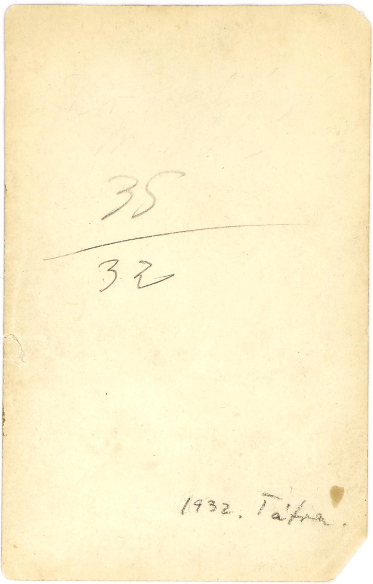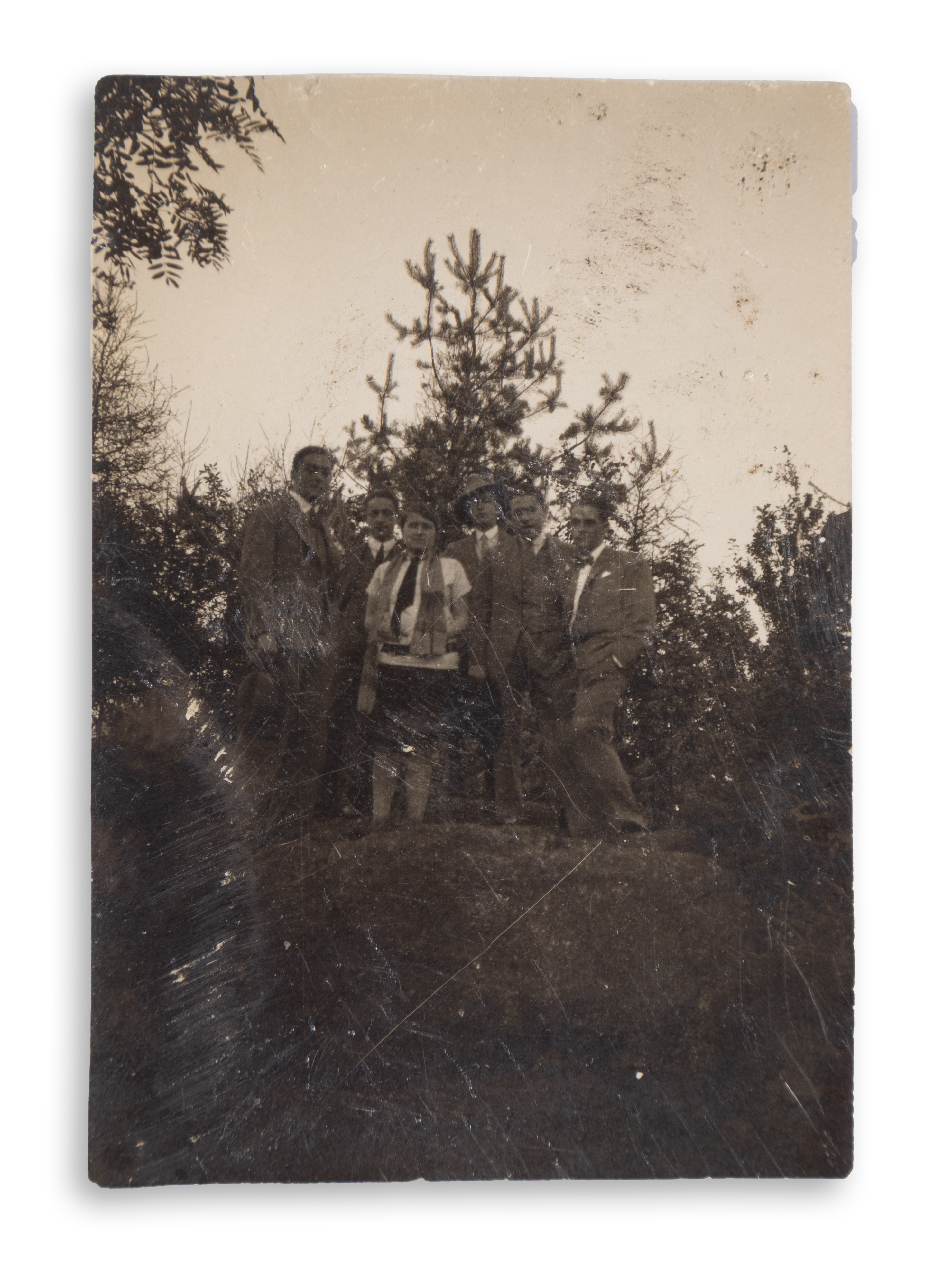 17. Radnóti Miklós (1909-1944) költő, műfordító publikálatlan fényképe, hátoldalán autográf bejegyzésével. A csoportkép egy csehországi kiránduláson készült. A költő barátaival 1927 szeptemberében járt a Reichenberg (ma Liberec) melletti völgyzáró gátnál. A Krähling Edit által szerkesztett kötetben két felvétel is szerepel az útról (57-58.) Mindkettő hátoldalára az itt is szereplő szöveget írta Radnóti: "Taalsperr 1927 szept. Fleischner". A dátum előtti szó a völgyzár német megfelelőjének (Talsperre) hibás alakja, a név pedig a kép készítőjére, Fleischner Istvánra utal. A képen a költő jobbról a második, a többi személy egyelőre azonosítatlan. Mérete: 80 x 55 mm.
