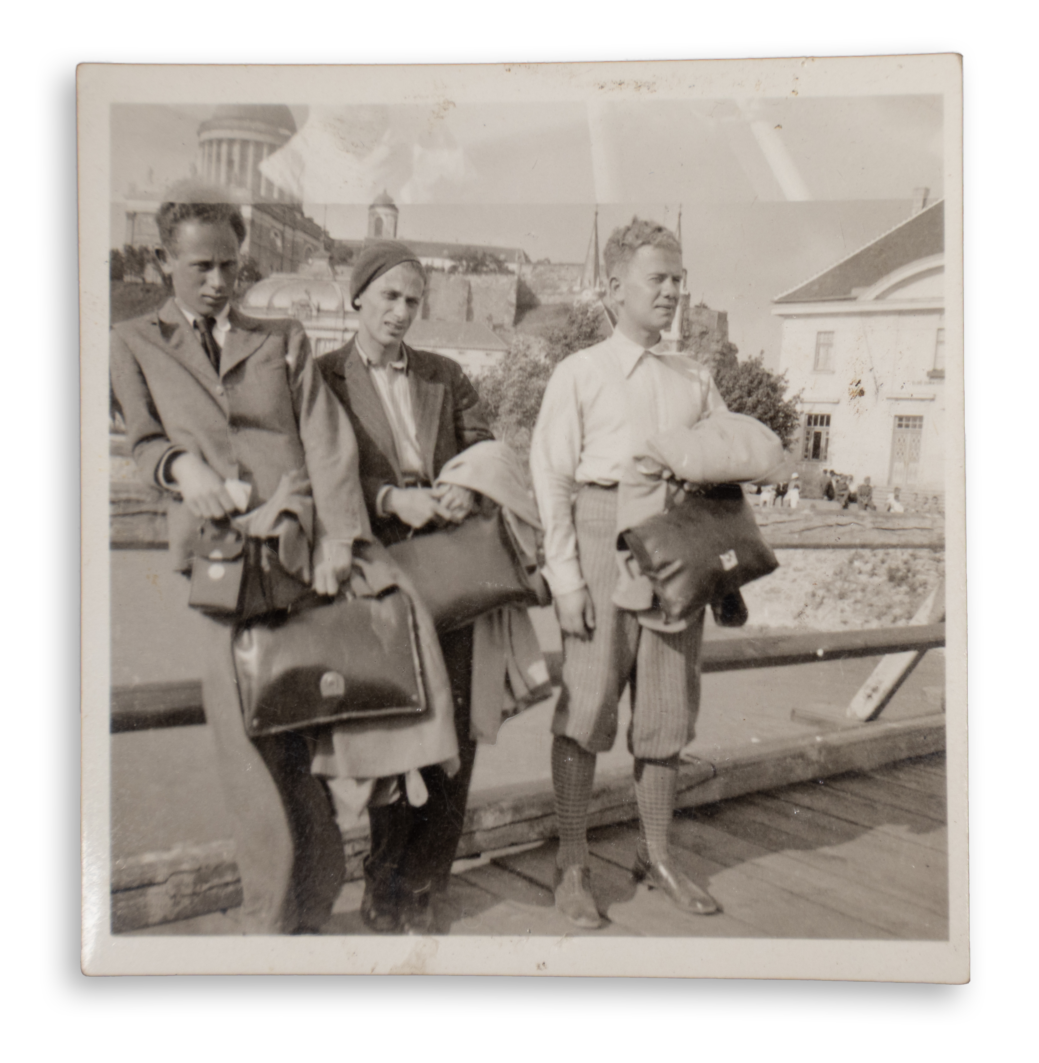 7. Radnóti Miklós Esztergomban egyetemi diáktársaival, Kun Miklóssal és Arató Ottóval, feltehetőleg az 1930-as évek elején. Radnóti középen. (Krähling: 131.) Mérete: 59 x 57 mm.