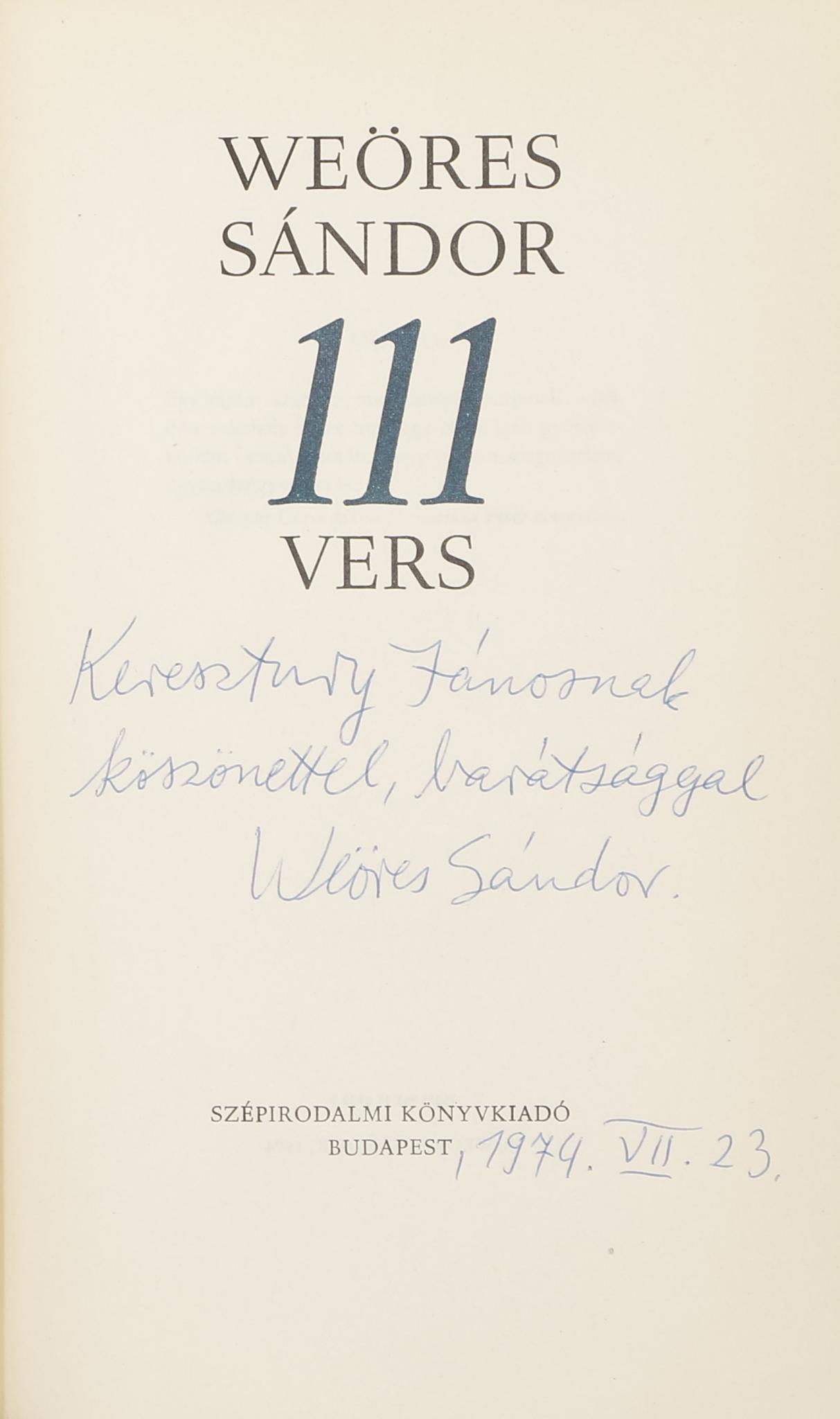 Szerző által dedikált példány: "Keresztury Jánosnak köszönettel, barátsággal Weöres Sándor. 1974. VII.23."