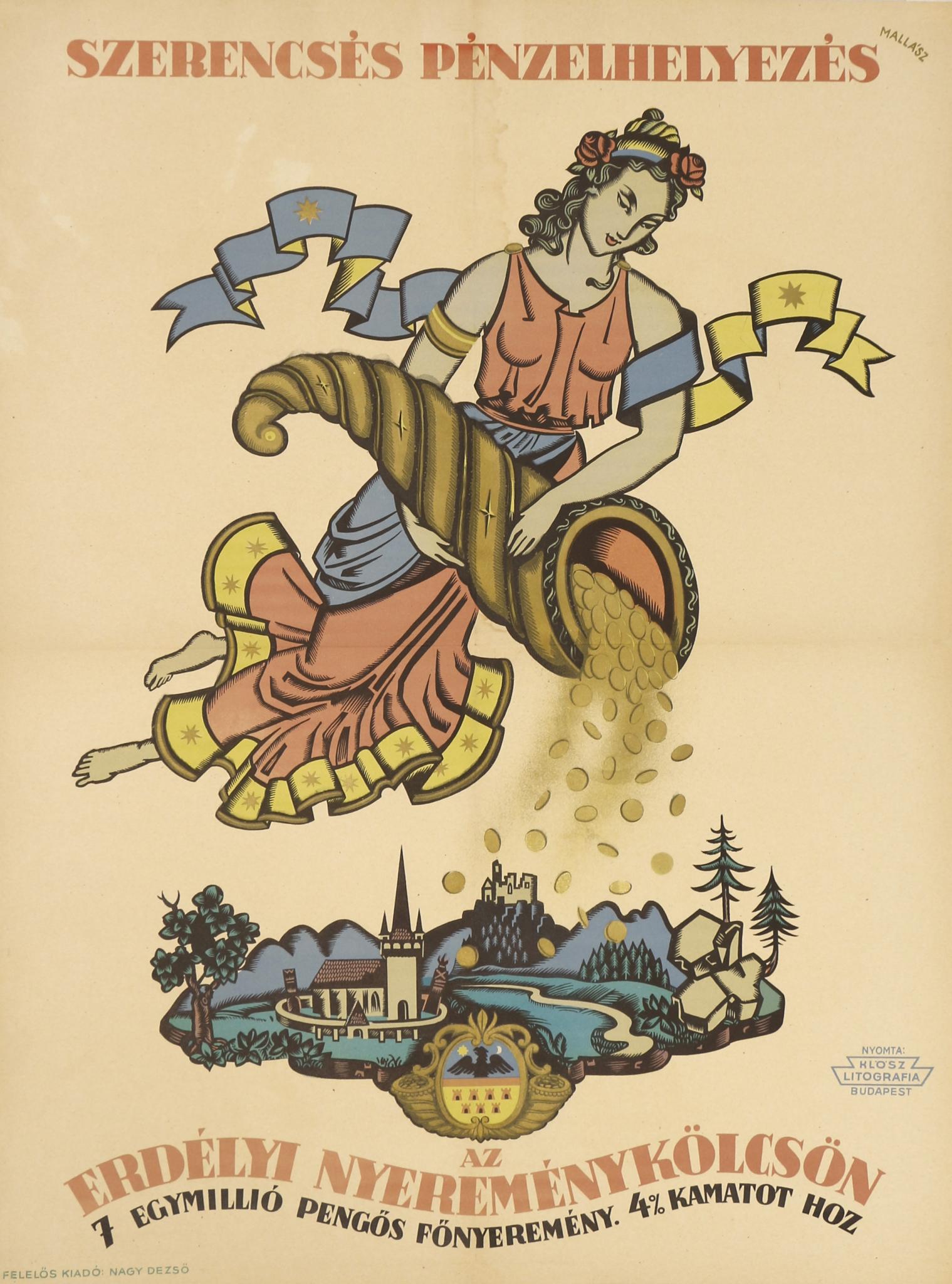 "Szerencsés pénzelhelyezés. Az erdélyi nyereménykölcsön 7 egymillió pengős főnyeremény. 4% kamatot hoz" reklámplakát