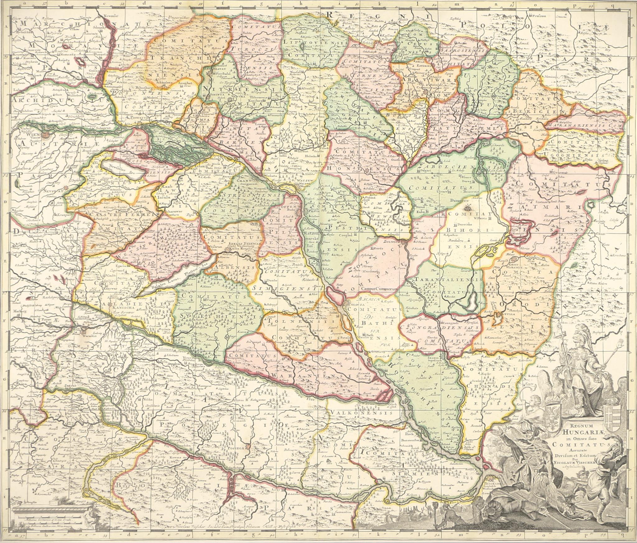 Beautifully coloured copper-engraved map of Hungary. Based on a map by the German Lowland cartographer Johannes de Ram, published as a separate sheet around 1690 in Amsterdam, without a grid. Very decorative cartouche in the lower right corner.