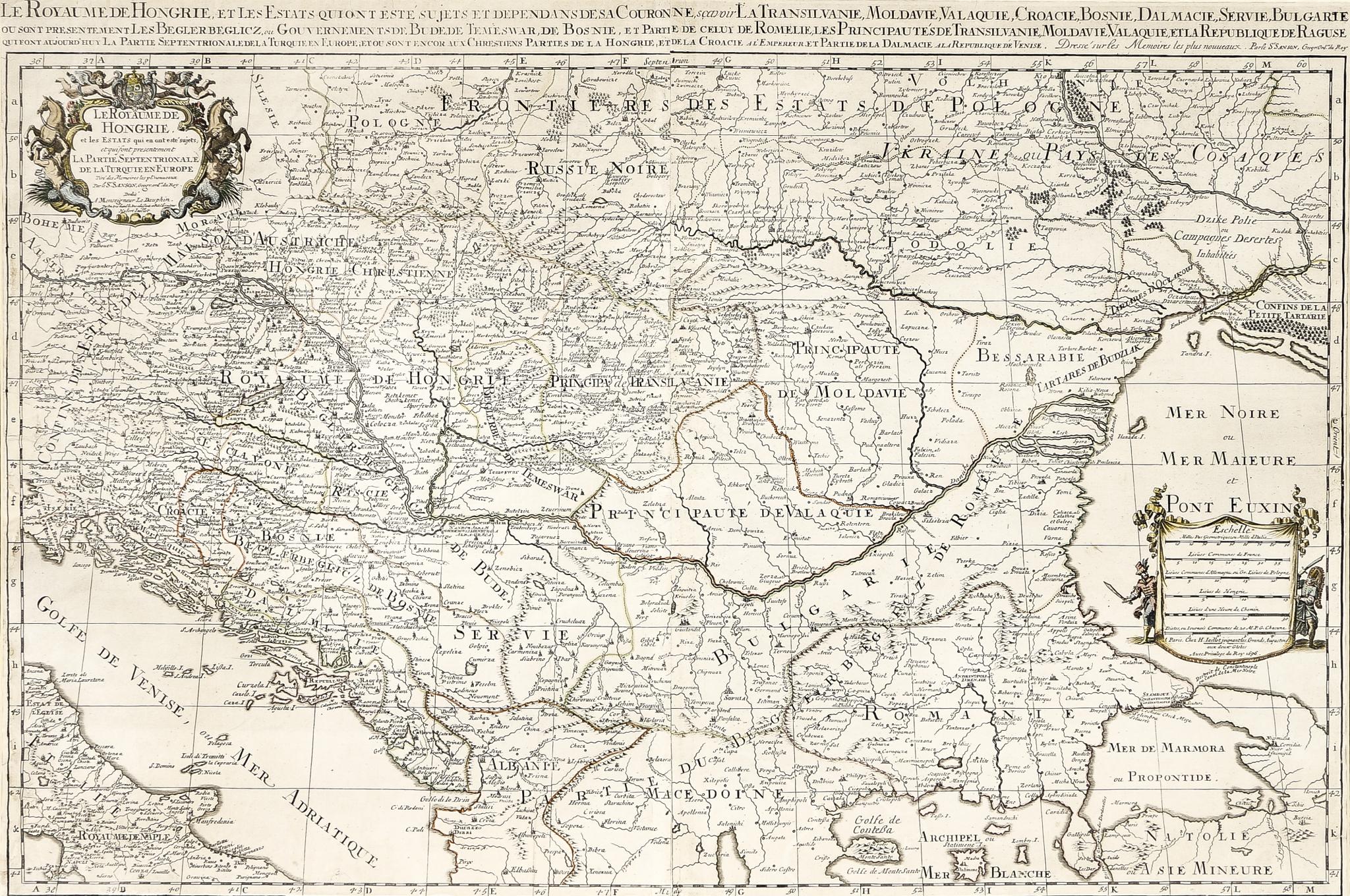 Striking large and highly detailed map of the Hungary, Austria, Poland, Transylvania, Moldovia, Bessarabia, Romania, Macedonia, Albania, Bulgaria, Bosnia, Croatia, Serbia, Dalmatia, Slovenia, the Ukraine and the Adriatic and Black Sea Region, with two Large decorative cartouches. A fine example with wide, clean margins. From Jaillot's monumental atlas.