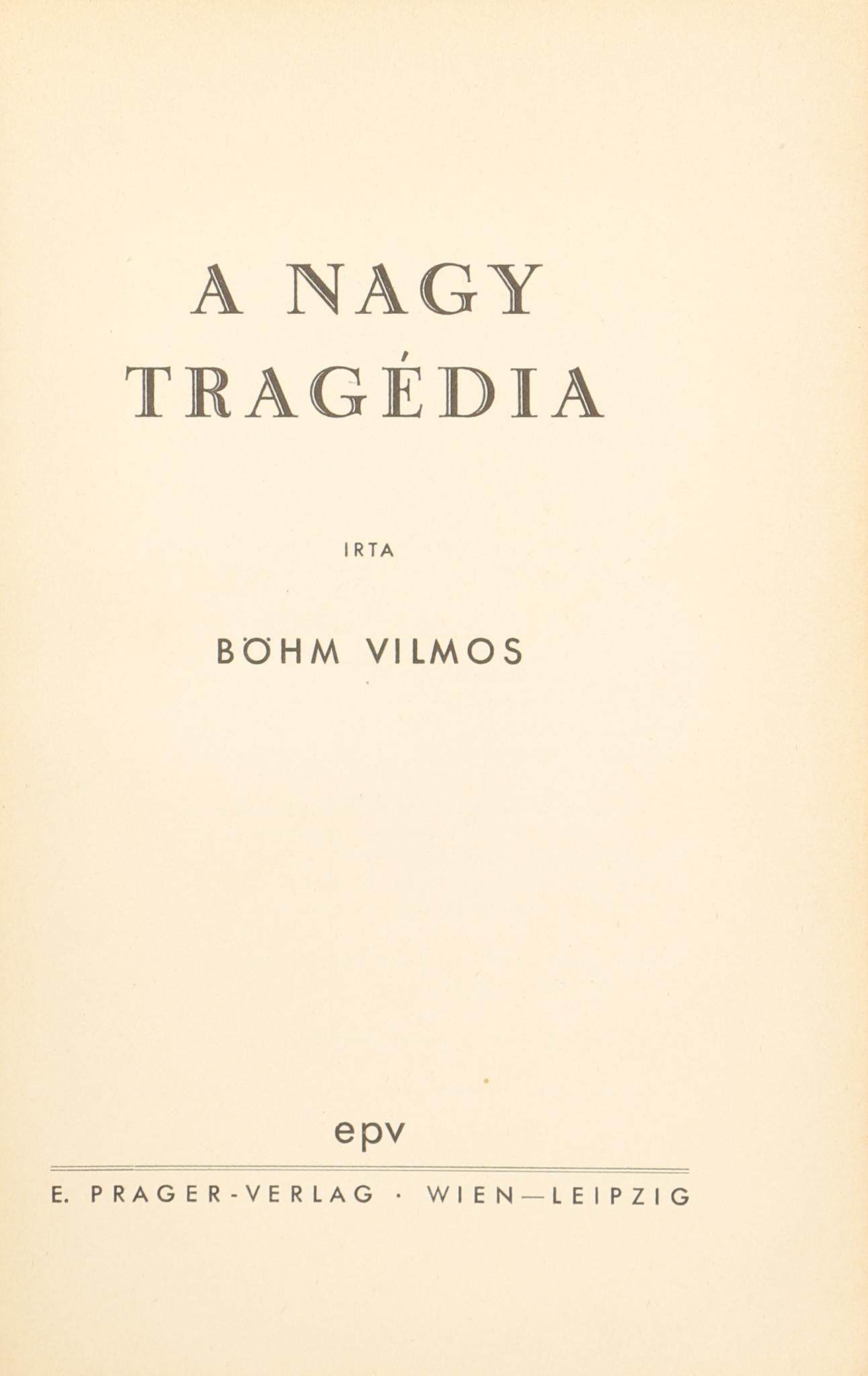 Szerző Böhm Vilmos A nagy tragédia Ár HUF 40 000 Category: History ID 103152 Wien-Leipzig, [1933]. E. Prager-Verlag. 77 + [2]p. A szerző képével illusztrált, fotómontázzsal díszített, kiadói papírborítóban. Illustrated paper wrappers