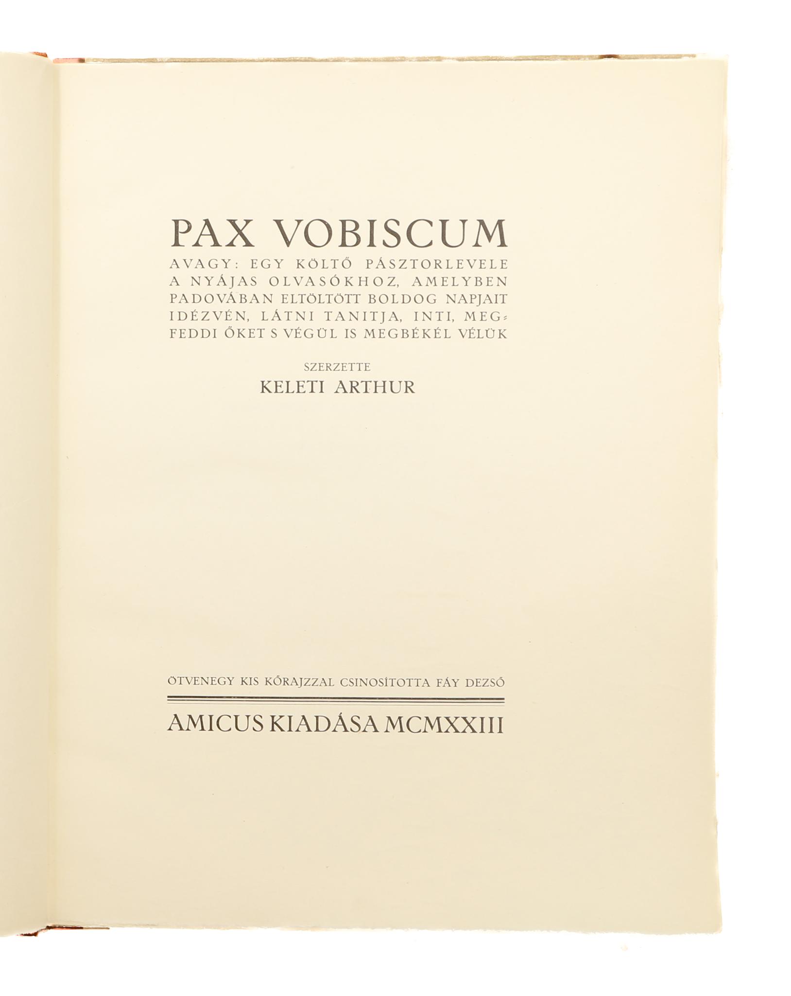 Keleti Arthur (1889–1969) költő, műfordító. Megjelent kötetei igen igényesek, szinte mind bibilofil műremek; könyveit olyan neves képzőművészek illusztrálták mint Gulácsy Lajos, Fáy Dezső vagy Vértes Marcell. Az 1922-ben kiadott Pax Vobiscum című alkotását 1913-as padovai élményei ihlették. Az olasz városról és lakóiról szóló művet „Gulácsy Lajosnak, Itália elborult szerelmesének” ajánlotta. A könyv illusztrálása Gulácsy tanítványának, Fáy Dezsőnek a munkája. A kötés szignált, készítette Biró Márta.
