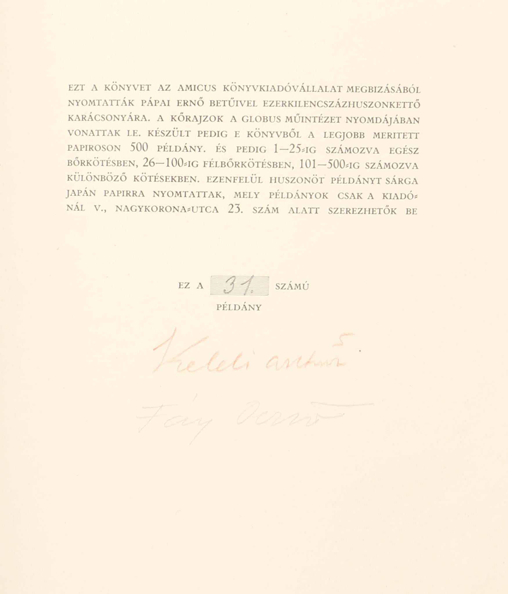 Kézzel számozott (31/26-100), a szerző és az illusztrátor által aláírt bibliofil példány.