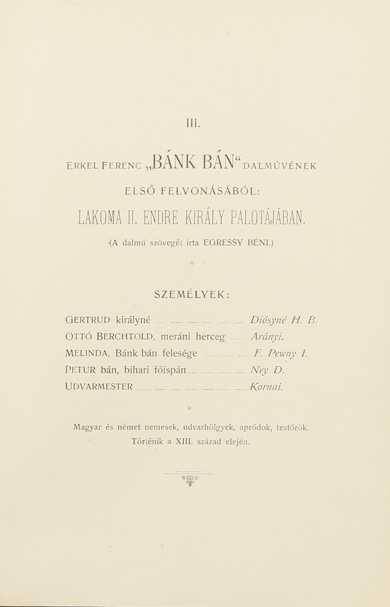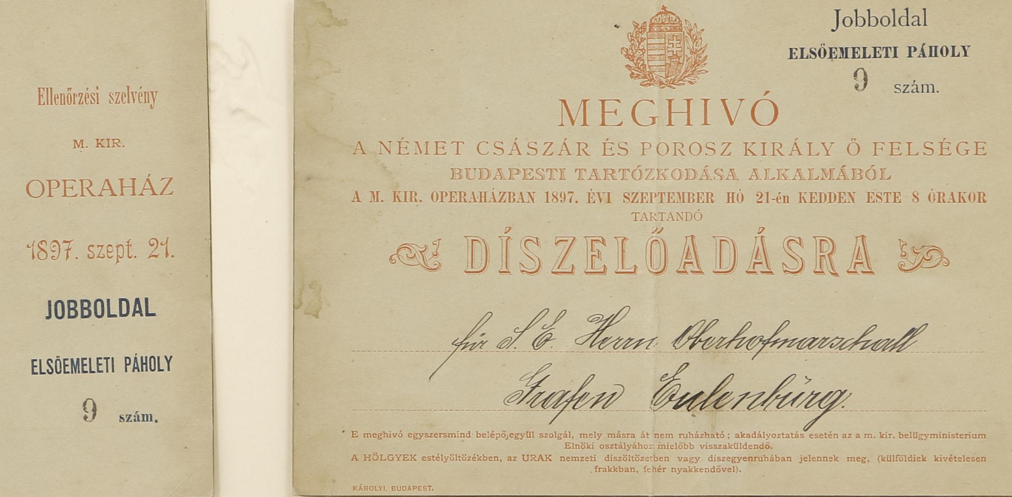 Részletek hangzottak el Erkel Ferenc Hunyadi László, Bánk bán és István király című dalműveiből, valamint egy csárdás, a Parasztlakodalom Erdélyben c. balettből. Mellékelve: A két színnel nyomott, számozott (9.) és tintával névre szólóan kitöltött meghívó az ellenőrző szelvénnyel Herrn Obermarschall Grafen Eulenberg számára. A megnevezett politikus, katonatiszt Eulenburg, August Graf zu (1838-1921) főmarsall, később miniszter, II. Vilmos jobbkeze volt.